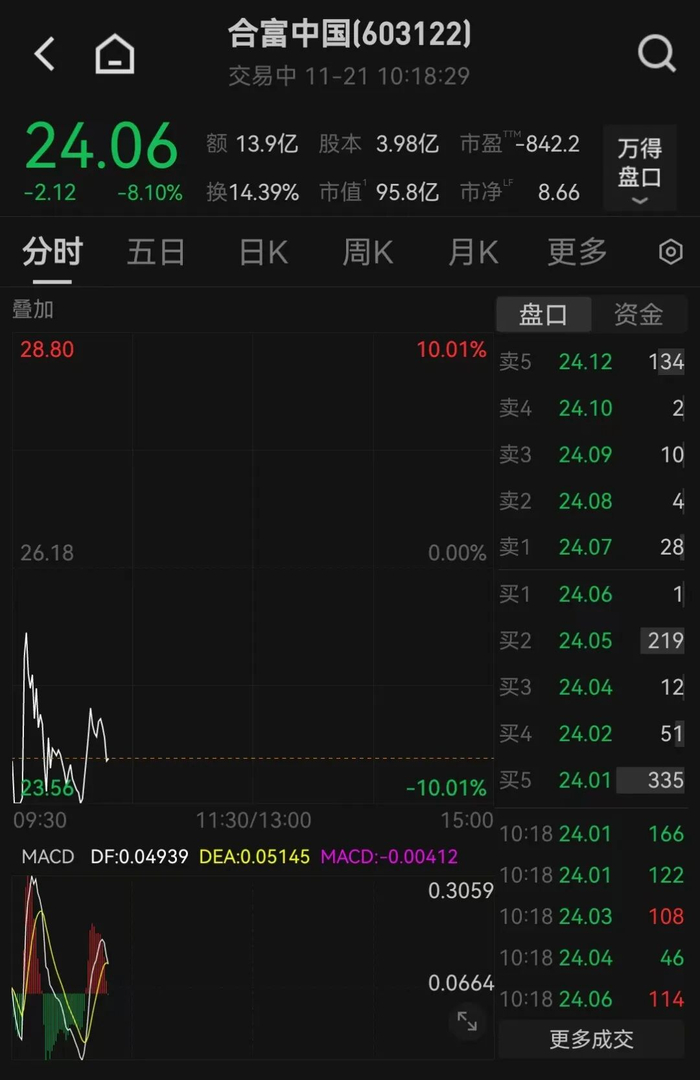公告提示,股价短期内连续上涨,存在市场情绪过热、非理性炒作风险,已明显高于同期行业及上证指 数涨幅,且严重显著偏离公司基本面,随时存在快速下跌风险。本次股价连续上涨期间,公司股票流通 换手率亦出现较大波动情形,击鼓传花效应明显。 编辑丨瑜见 昨日晚间,合富中国公告,公司股价累计涨幅已严重偏离基本面,投资者参与交易可能面临较大风险。 如公司股价进一步异常上涨,公司可能申请停牌核查。自2025年10月28日至2025年11月20日,公司股票 有十三个交易日以涨停价收盘,并5次触及股价异常波动、3次触及严重异常波动情形,期间累计涨幅高 达291.92%。 11月21日,合富中国大幅低开,随后快速下挫跌停,截至发稿,合富中国跌超8%,成交额超13亿元。 昨日,合富中国复牌涨停,走出15天13板行情。 | 合富中国(603122) | < コ | | | --- | --- | --- | | 交易中 11-21 10:18:29 | | | | 24.06 额 13.9亿 股本 3.98亿 市盈™-842.2 | | 万得 | | -2.12 -8.10% 换14.39% 市值 95.8亿 市净 8.66 | | 盘 ...