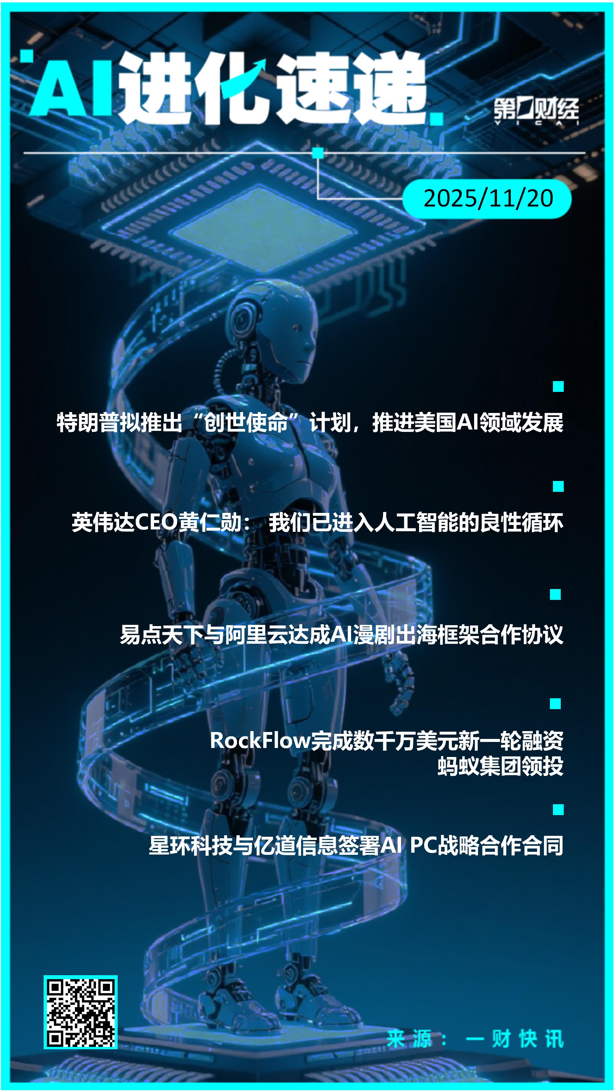 ①特朗普拟推出"创世使命"计划,推进美国AI领域发展;②英伟达CEO黄仁勋: 我们已进入人工智能(AI)的良性循环;③易点天下与阿里云达成AI漫剧 出海框架合作协议。 ①特朗普拟推出"创世使命"计划,推进美国AI领域发展; ②英伟达CEO黄仁勋: 我们已进入人工智能(AI)的良性循环; ③易点天下与阿里云达成AI漫剧出海框架合作协议; ④RockFlow完成数千万美元新一轮融资,蚂蚁集团领投; ⑤星环科技与亿道信息签署AI PC战略合作合同。 "创世使命" 特朗普拟推出 英伟达CEO黄仁勋:我们已 易点天下与阿里云达成 RockFlows 星环科技与亿道信息 i tion i ...