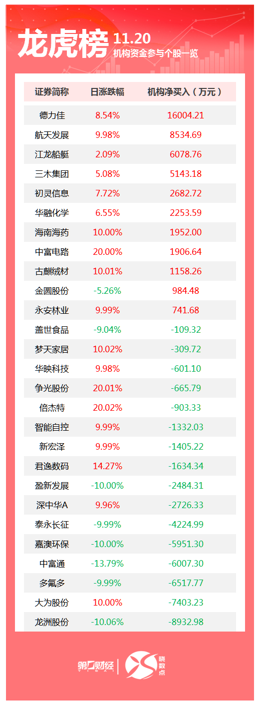 机构资金流向概况 - 11月20日龙虎榜数据显示共有27只个股出现机构身影[1] - 其中11只股票呈现机构净买入 16只股票呈现机构净卖出[1] 机构净买入前三个股 - 德力佳获机构净买入1.6亿元 当日涨幅8.54%[1][2] - 航天发展获机构净买入8535万元 当日涨停涨幅9.98%[1][2] - 江龙船艇获机构净买入6079万元 当日涨幅2.09%[1][2] 其他机构净买入显著个股 - 三木集团获机构净买入5143万元 当日涨幅5.08%[2] - 初景信息获机构净买入2682万元 当日涨幅7.72%[2] - 华融化学获机构净买入2254万元 当日涨幅6.55%[2] - 中富电路获机构净买入1907万元 当日涨停涨幅20.00%[2] - 古麒绒材获机构净买入1158万元 当日涨停涨幅10.01%[2] 机构净卖出前三个股 - 龙洲股份遭机构净卖出8933万元 当日跌幅10.06%[1][3] - 大为股份遭机构净卖出7043万元 当日涨停涨幅10.00%[1][3] - 多氟多遭机构净卖出6518万元 当日跌幅9.99%[1][3] 其他机构净卖出显著个股 - 嘉澳环保遭机构净卖出5951万元 当日跌停跌幅10.00%[3] - 中富通遭机构净卖出6007万元 当日跌幅13.79%[3] - 泰永长征遭机构净卖出4225万元 当日跌停跌幅9.99%[3] - 深中华A遭机构净卖出2726万元 当日涨幅9.96%[3] - 盈新发展遭机构净卖出2484万元 当日跌停跌幅10.00%[3]