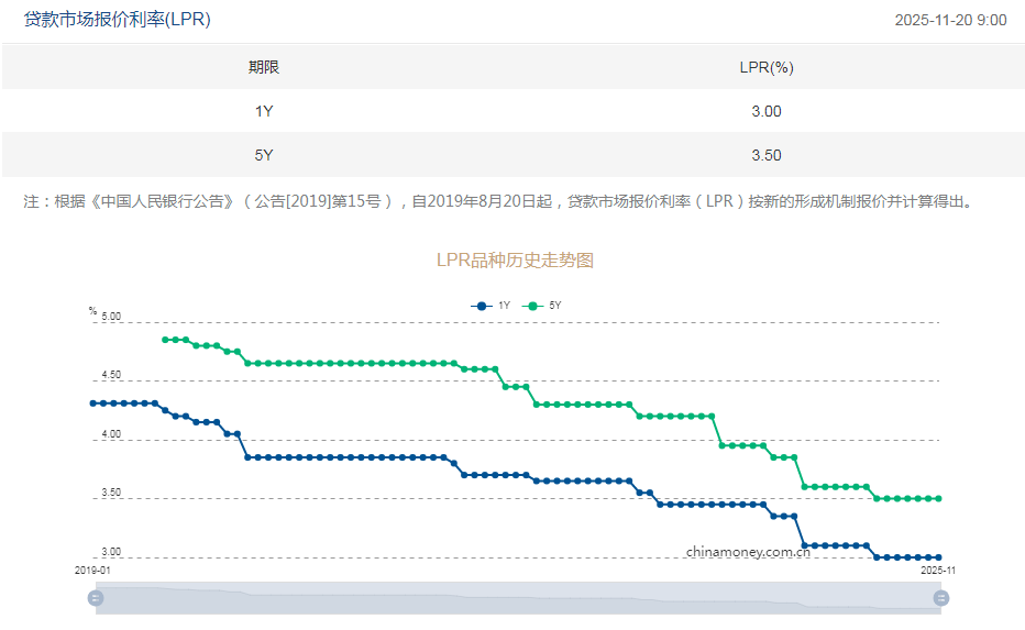 贷款市场报价利率(LPR)最新报价 - 2025年11月20日公布的1年期LPR为3.00% [2][3] - 2025年11月20日公布的5年期以上LPR为3.50% [2][3] 贷款市场报价利率(LPR)月度环比变化 - 11月1年期LPR与上月持平 均为3% [2] - 11月5年期以上LPR与上月持平 均为3.5% [2]