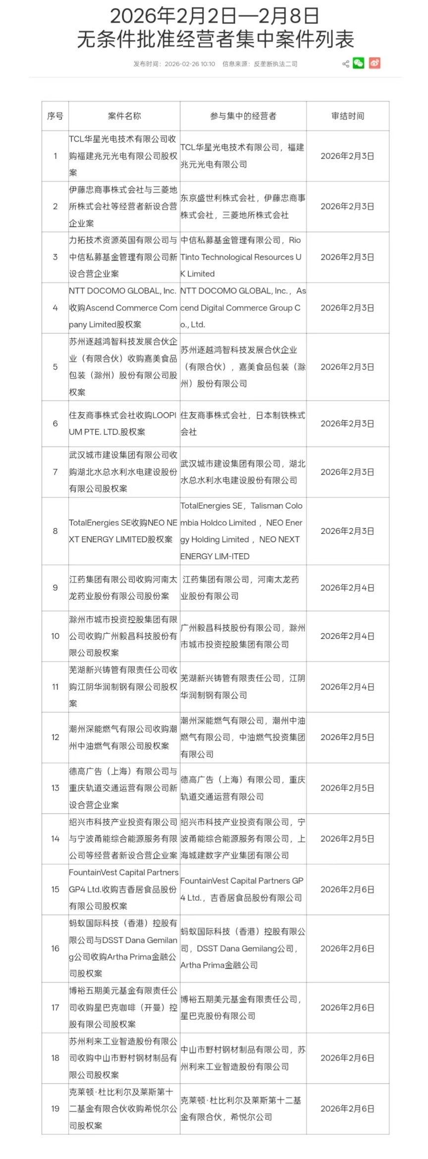 市场监管总局无条件批准的经营者集中案件列表 - 市场监管总局公布了2026年2月2日至2月8日期间无条件批准的经营者集中案件列表[1] - 列表共包含19起已审结的案件,涉及股权收购和新设合营企业等多种交易类型[2][3] 半导体显示行业 - TCL华星光电技术有限公司收购福建兆元光电有限公司股权案于2026年2月3日获得无条件批准[1][2] - 该交易标志着半导体显示行业内的进一步整合 跨国公司与私募股权交易 - 伊藤忠商事株式会社与三菱地所株式会社等经营者新设合营企业案于2026年2月3日获批[2] - 力拓技术资源英国有限公司与中信私募基金管理有限公司新设合营企业案于2026年2月3日获批[2] - NTT DOCOMO GLOBAL, Inc. 收购Ascend Commerce Company Limited股权案于2026年2月3日获批[2] - 住友商事株式会社收购LOOPIUM PTE. LTD.股权案于2026年2月3日获批[2] - TotalEnergies SE收购NEO NEXT ENERGY LIMITED股权案于2026年2月3日获批[2] - 克莱顿·杜比利尔及莱斯第十二基金有限合伙收购希悦尔公司股权案于2026年2月6日获批[3] 中国国内产业整合 - 苏州逐越鸿智科技发展合伙企业收购嘉美食品包装(滁州)股份有限公司股权案于2026年2月3日获批[2] - 武汉城市建设集团有限公司收购湖北水总水利水电建设股份有限公司股权案于2026年2月3日获批[2] - 江药集团有限公司收购河南太龙药业股份有限公司股份案于2026年2月4日获批[3] - 滁州市城市投资控股集团有限公司收购广州毅昌科技股份有限公司股权案于2026年2月4日获批[3] - 芜湖新兴铸管有限责任公司收购江阴华润制钢有限公司股权案于2026年2月4日获批[3] - 潮州深能燃气有限公司收购潮州中油燃气有限公司股权案于2026年2月5日获批[3] - 苏州利来工业智造股份有限公司收购中山市野村钢材制品有限公司股权案于2026年2月6日获批[3] 新设合营企业 - 德高广告(上海)有限公司与重庆轨道交通运营有限公司新设合营企业案于2026年2月5日获批[3] - 绍兴市科技产业投资有限公司与宁波甬能综合能源服务有限公司等经营者新设合营企业案于2026年2月5日获批[3] 消费品与食品行业 - FountainVest Capital Partners GP4 Ltd.收购吉香居食品股份有限公司股权案于2026年2月6日获批[3] - 博裕五期美元基金有限责任公司收购星巴克咖啡(开曼)控股有限公司股权案于2026年2月6日获批[3] 金融科技与海外投资 - 蚂蚁国际科技(香港)控股有限公司与DSST Dana Gemilang公司收购Artha Prima金融公司股权案于2026年2月6日获批[3]