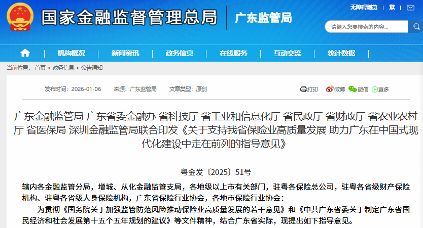 【环球网财经综合报道】近日,广东金融监管局相关部门正式印发《关于支持我省保险业高质量发展助力广东在中国 式现代化建设中走在前列的指导意见》(下称《指导意见》)。《指导意见》紧扣广东"走在前、作示范、挑大梁"的 定位,以强监管、防风险、促高质量发展为主线,是为加快建设金融强省,切实发挥保险经济"减震器"和社会"稳定 器"功能,助力筑牢经济安全网、社会保障网和灾害防控网。 数据显示,广东金融业发展态势强劲,增加值已突破万亿元大关,保险业成为广东高质量转型发展的"金引擎"。截至 2025年三季度末,广东银行业保险业总资产超过44万亿元,占全国的8.78%,年均增长超8%,"险资入粤"投资规模达 2.26万亿元。在此基础上,《指导意见》进一步明确了保险业的功能定位,引导行业从单纯追求业务规模转向更加注 重风险保障、预期稳定和制度支撑功能。 为服务科技创新,广东将建立"全链条、多层次、可持续"的科技保险体系。《指导意见》引导保险机构聚焦研发损 失、设备损失、专利保护、网络安全等重点领域,以及科技成果首试首用、中试验证等关键环节,丰富科技保险产 品。特别支持首台(套)重大技术装备保险、重点新材料首批次应用保险等推广应用, ...