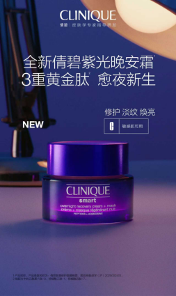 倩碧紫光晚安霜 日常熬夜,令肌肤老化不再是单一纹路的困扰,更是暗沉、松垮等多重肌肤问题并发的综合考验。当肌 肤状态频频告急,如何系统性应对?Clinique倩碧紫光晚安霜应需而来,依托品牌35年胜肽专研积累, 以精准成分配比与靶向淡纹科技,专注应对肌肤夜间淡纹修护需求。 Clinique倩碧紫光晚安霜搭载品牌专研的"黄金肽三角"淡纹体系,实现精准靶向淡纹修护,类肉毒肽帮 助阻断肌肉收缩信号,从而减缓动态纹产生;双重信号肽则深入肌底激活胶原蛋白的新生,提升肌肤韧 性。三者协同作用,从预防到激活层层递进,精准应对不同层次的老化问题。 倩碧紫光晚安霜复配"3重修愈能量"。腺苷帮助舒缓肌肤泛红易敏状态,改善因外界刺激引发的肌肤脆 弱问题;麦角硫因作为高效抗氧成分,加速修护肌肤屏障损伤;12%HA则为肌肤注入充沛水分,实现 即刻水润充盈,使干纹细纹得到显著改善。 倩碧紫光晚安霜 2026年1月,雅诗兰黛集团旗下皮肤学专业品牌Clinique倩碧再度以科学之力重塑夜间淡纹护肤体验,重 磅推出全新——Clinique倩碧紫光晚安霜。作为倩碧紫光淡纹系列的全新力作,Clinique倩碧紫光晚安霜 凝聚品牌皮肤学淡纹专家35年 ...
