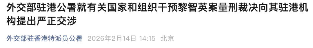 外交交涉 - 外交部驻港公署于2026年2月11日和12日约见英国、美国、澳大利亚等国及欧盟驻港机构负责人 [1] - 交涉针对上述国家和组织官方及政客就黎智英案量刑裁决发表的负面言论 [1] - 交涉内容为提出严正交涉,表达强烈不满和坚决反对 [1] 核心要求 - 敦促相关国家、组织及政客切实尊重中国主权和香港法治 [1] - 要求其立即停止对香港国安案件审理发表不负责任言论 [1] - 要求其立即停止以任何形式干预香港事务、干涉中国内政 [1]