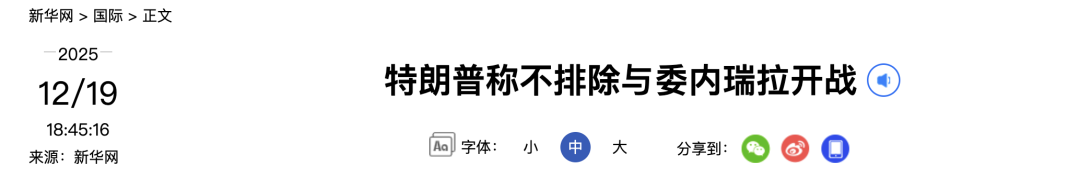 据美国媒体19日报道,美国总统特朗普在接受采访时说,不排除与委内瑞拉开战的可能性。 特朗普在接受美国全国广播公司电话采访时表示:"我不排除这种可能,不会排除。" 特朗普称不排除与委内瑞拉开战 报道说,特朗普表示将继续扣押更多油轮。 特朗普拒绝说明推翻委内瑞拉总统马杜罗是否是他的最终目标。"他完全清楚我想要什么。"特朗普说,"他比任何人都更明白这一点。" ...
