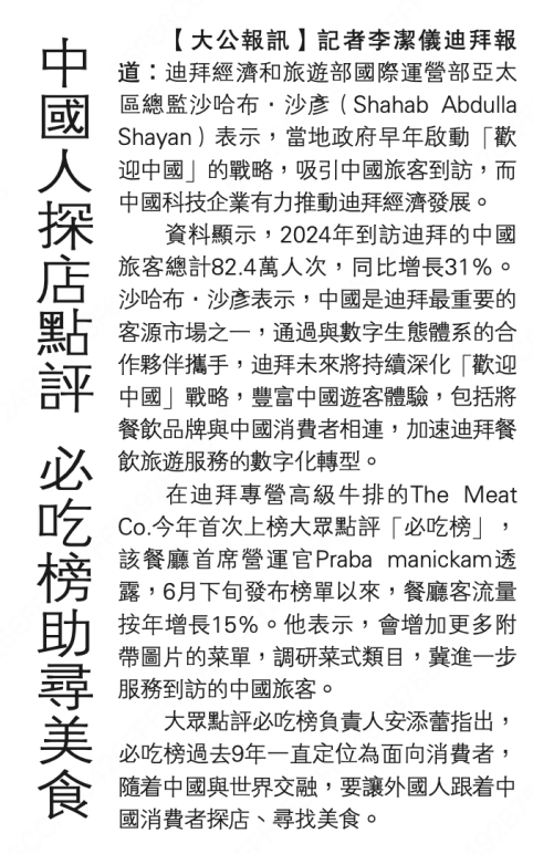 【环球网科技报道 记者 李文瑶】近日,《大公报》报道称,大众点评"必吃榜"正在成为全球食客寻找美食的新指南。 据了解,11月10日,2025大众点 评"必吃榜"首场海外发布会落地迪拜,28个中国港澳台及海外地区348家餐厅上榜,香港、澳门、东京、大阪、新加坡为上榜餐厅数TOP5。 迪拜经济和旅游部国际运营部亚太区总监沙哈布·沙彦在发布会上表示赞赏,认为此举"将加速迪拜餐饮旅游服务的数字化转型"。会后,迪拜旅游局官方微 信公众号也发文指出,大众点评正式发布2025 海外必吃榜,迪拜共有 10 家餐厅上榜, 迪拜的美食高光时刻来了。 "必吃榜"的独特之处在于其基于用户评价文本和人工智能的评选体系。据大众点评"必吃榜"负责人介绍,该榜单完全依托B端自研大模型,对用户真实评价 进行深度分析,历经六个月的AI建模分析、公信力核查等严格流程,最终评选出优质餐厅。在2025年评选中,近30%的商户因未能通过"评价真实可信"核查 而被淘汰。 这种科技驱动、基于国人点评的评选方式确保了榜单的客观性和权威性,也意味着它更适合中国人口味。2025年"必吃榜"在中国港澳台及海外地区新增15个 发榜城市,总上榜餐厅数较去年增长50%。 ...