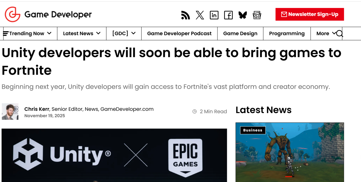 【环球网科技综合报道】11月20日消息,据Game Developer报道,Epic Games与Unity正式宣布达成合作,Unity引擎将全面引入《堡垒之夜》游戏,双方将 携手推动这款热门游戏向"开放元宇宙"空间升级,为全球玩家与创作者带来全新体验与发展机遇。 据介绍,合作升级后,《堡垒之夜》的游戏大厅浏览体验将更加便捷直观,有望实现类似刷视频般的流畅交互,玩家还可直接通过网页浏览游戏内容、购买 皮肤道具。未来,游戏将突破单一运营主体的限制,玩家可从游戏内跳转至其他公司旗下的网站式内容,Epic将不参与相关内容开发、不追求直接营收,也 不签署商业合作协议,全力打造开放共享的生态环境。 事实上,Epic近年来已持续推动《堡垒之夜》的生态扩容,从纯"吃鸡"模式拓展为类似《Roblox》的大型综合生态系统,成功吸引7万名创作者参与,累计 发布20万种体验内容。Unity CEO Matt Bromberg透露,预计明年《堡垒之夜》将正式上线基于Unity引擎的相关体验,为全球玩家与创作者带来更多可能。 (纯钧) 作为全球知名的游戏作品,《堡垒之夜》此前处于封闭生态系统中,创作者仅能使用Epic专属工具进行内容创 ...