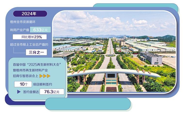 国家级"城市矿产"示范基地、国家级资源综合利用基地、国家级再生资源回收体系试点城市、国家级绿色产 业示范基地……凭借着一块块"国字号"招牌,广西梧州按照"种类丰富的再生金属、庞大的资源集聚、企业高 度集中、管理规范化"的独特模式发展再生材料产业,硬是从废旧物中掏出超600亿元产值。 航拍梧州临港经济区。(资料图片) 梧州优势何在?一方面,毗邻粤港澳大湾区,西江水道航运升级,产业基础完善,梧州承接再生材料产业区 位优势明显;另一方面,梧州积极推动完善循环产业链条,已形成涵盖再生不锈钢、再生铜、再生铝、再生 铅锌、再生塑料以及再制造等循环产业体系。产业聚集效应持续发挥,不断激发再生材料产业动能。 发挥集聚效应 生产车间里,熔炉正旺,钢水通红、火花飞溅。设备轰鸣间,废钢经过熔炼、铸造等多道工序,轧制成一卷 卷精密钢卷。成品库里,钢卷整齐码放,工人正在清点、装车,准备发往浙江、江苏、广东等地。这是梧州 市再生不锈钢制品产业园内永达钢铁集团火热的生产场景。 "考虑不锈钢生产的耗能、水电成本、物流运输、新工安置和培训,入驻园区不是换个地方搞生产那么简 单。"梧州市永达钢铁集团董事长伍灼富盘算起经济账,列举着梧州优良的区位 ...