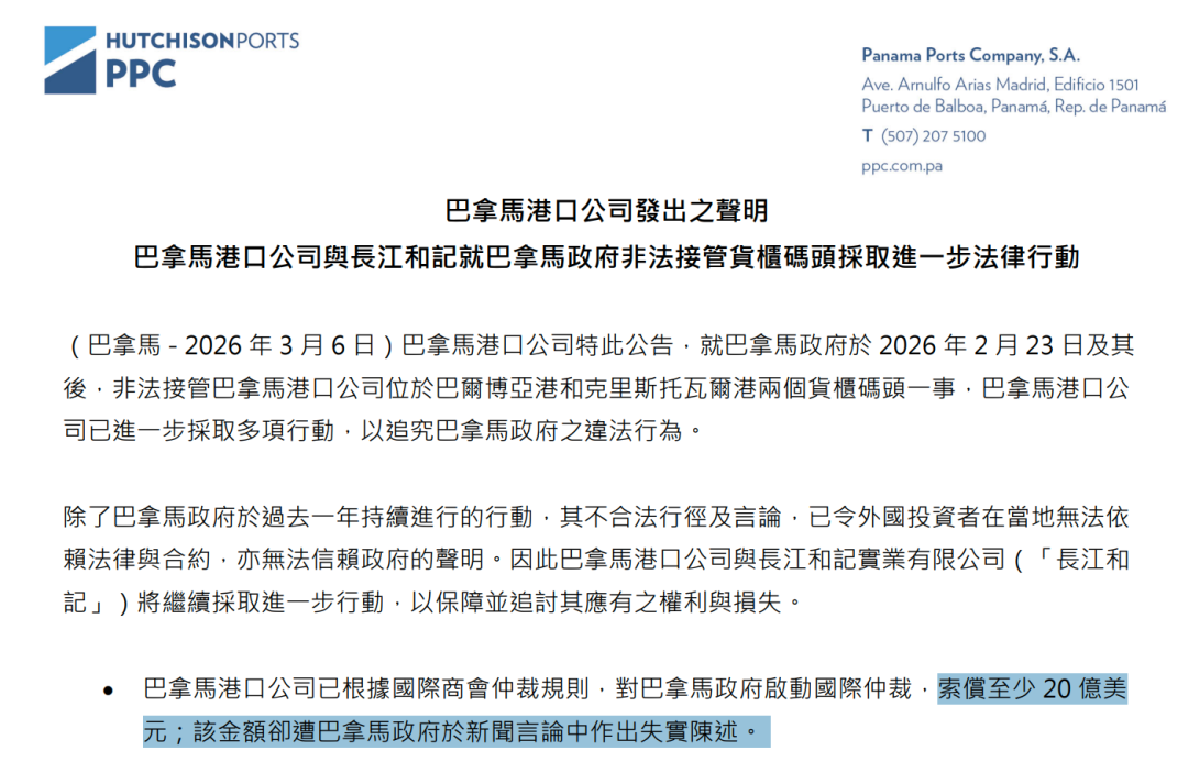 事件概述 - 长江和记实业旗下巴拿马港口公司因巴拿马政府强制接管其运营的两个港口,已启动国际仲裁程序,索赔至少20亿美元(约合人民币138.43亿元)[2] - 公司强调将就巴拿马政府的严重违约及反投资者行为,全数追索其应得的一切权益,并永久保留所有法律权利及追索权[2] 公司声明与指控内容 - 公司已根据投资保护条约向巴拿马政府发出争议通知,并提交补充文件,指控巴拿马政府拒绝沟通、中断磋商,并在欠缺透明度的情况下占用码头、强行接管公司财产及员工[5] - 公司指出巴拿马政府变本加厉,针对公司发表多项不实言论,令情况恶化[5] - 巴拿马港口公司已就第23号行政法令提出行政呈请,要求重新考虑,并拒绝接受政府不合法的文件没收行为[5] - 公司不同意巴拿马政府的偏颇行为,将继续评估形势,诉诸一切可行的国内及国际法律程序[5] 市场反应 - 截至2026年3月9日发稿,长和股价下跌5.2%,报每股58.35港元,总市值为2235亿港元[5]