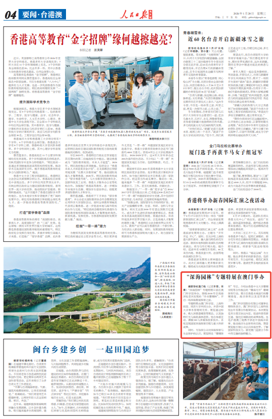 展览活动 - “深海园林”专题特展在澳门科学馆举办,围绕2018年在南海深处首次发现的“冷水珊瑚林”进行展示[1] - 展览由澳门科学馆、上海科技馆、同济大学共同主办,并获中国大洋事务管理局支持[1] - 展览通过标本、载人深潜器模型、独特灯光与海底森林造景,结合体感互动、裸眼3D与多媒体投影技术,系统呈现国家深海探索历程与重大科研成果[1] 合作与意义 - 本次展览是澳门科学馆与上海科技馆落实去年签署的合作框架协议,促进科普资源互通、强化区域联动的成果体现[1] - 展览是沪港澳三地携手讲述中国海洋故事、推动海洋生态保育的实践[1] - 展览特设“珊瑚保育”专区,介绍由香港中文大学珊瑚学院等合作推出的“珊海无尽”珊瑚保育行动,展示在香港水域进行的珊瑚修复、海洋保育以及宣传教育工作[1] 其他新闻要闻 - 香港高等教育“金字招牌”越擦越亮,旨在提升国际学术竞争力并打造“留学香港”品牌[5][6] - 近60名台湾青年开启新疆冰雪之旅[7] - 厦门选手再次获得半程马拉松女子组冠军[8] - 香港将举办新春国际汇演之夜活动[8] - 闽台乡建乡创合作,共同田园追梦[11]
