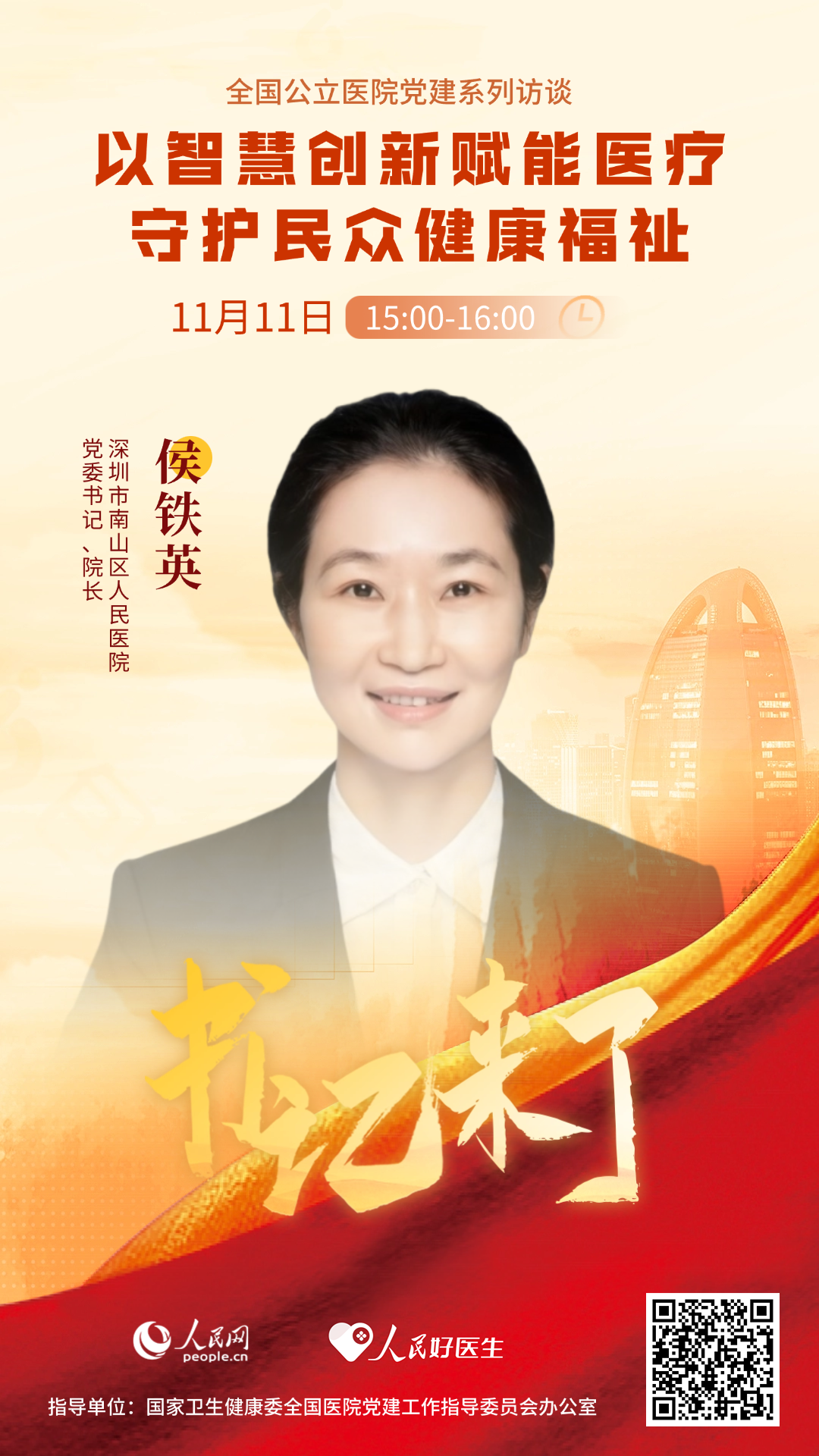 专家介绍: 侯铁英,深圳市南山区人民医院党委书记、院长。博士研究生、博士研究生导师、主任医师。国家卫健委医疗机构感染防控专家委员会专家,国家卫 生健康标准委员会医院感染控制标准委员会委员,国家卫健委医院管理研究所医院感染质量管理与控制专家咨询组专家,国家卫生健康标准委员会临床检 验质量委员会委员,国家临床检验专业医疗质量控制中心专家委员会委员,国家医院感染管理医疗质量控制中心专家委员会委员。 为助力公立医院开展党建工作,加强党建工作经验交流与分享,由国家卫健委全国医院党建工作指导委员会办公室指导的公立医院党建栏目《书记来 了》在人民好医生客户端上线,邀请全国公立三甲医院党委书记做客栏目,畅谈党建心得与经验。 公立医院如何通过党建引领促进学科发展,助力医疗服务质量提升?11月11日15:00至16:00,深圳市南山区人民医院党委书记、院长侯铁英将做客 《书记来了》,与大家分享医院在加强党建、推动智慧医院建设以及促进医院高质量发展等方面的经验和做法,敬请关注。 一、下载人民好医生App,点击"名医直播"进入栏目进行收看。 更多贴心易懂的健康科普,三甲名医直播互动,请关注人民好医生APP 二、关注人民健康公众微信号 ...