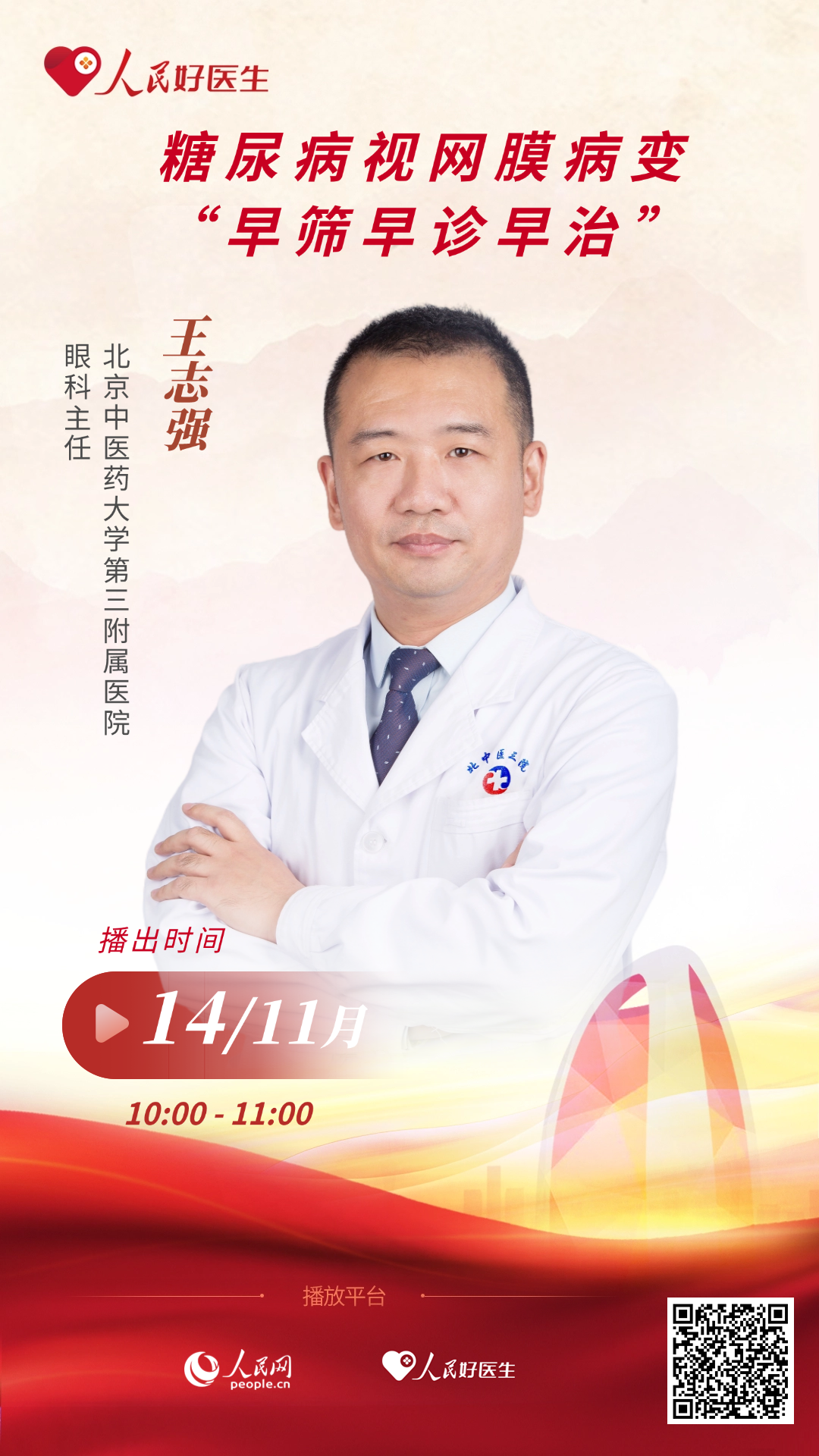 糖尿病视网膜病变(简称"糖网",DR)是糖尿病最常见且严重的微血管并发症之一,已成为我国工作年龄人群致盲的首要原因。其发病隐匿,早期 往往无明显症状,待患者察觉视力下降时,病变多已进展至中晚期,错过了最佳治疗时机,造成不可逆的视功能损伤。 11月14日10:00-11:00,北京中医药大学第三附属医院眼科主任王志强做客"人民好医生"科普直播间,为您深入讲解如何构建从全身到眼部的全周期管 理防线,有效遏制"糖网"的进展,守护每一位糖尿病患者的视觉健康与生活质量。 嘉宾简介: 王志强,北京中医药大学第三附属医院眼科主任、医学博士、主任医师。同时担任中国中医药信息学会眼科分会常务副会长兼秘书长,中国医药教育 协会科普健康教育工作委员会主任委员,中国医师协会中西医结合医师分会眼科专业委员会副秘书长等学术职务。 如何收看直播: 一、下载人民好医生App,点击"名医直播"进入栏目进行收看。 更多贴心易懂的健康科普,三甲名医直播互动,请关注人民好医生APP 二、关注人民健康公众微信号(微信号:rmwjkpd),右下角点击健康互动 "下载人民好医生App",下载后进入客户端收看。 重要提示:人民好医生客户端只提供疾病科普,不 ...