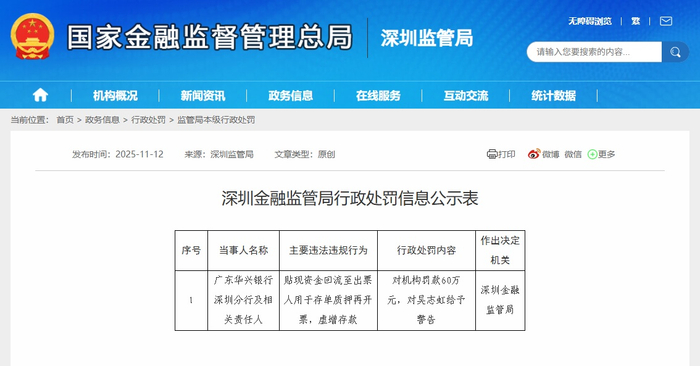 圳金融监管局官网截图 | | | 国家金融监督管理总局 | | | 深圳监管局 | | 无障碍浏览 第 区 | | --- | --- | --- | --- | --- | --- | --- | --- | | | | | | | | | 请输入您要搜索的内容 ... Q | | C | | 机构概况 新闻资讯 政务信息 在线服务 互动交流 | | | | 统计数据 | | | | | 当前位置:首页 > 政务信息 > 行政处罚 > 监管局本级行政处罚 | | | | | | | | 发布时间:2025-11-12 来源:深圳监管局 文童类型:原创 品打印 6 微博 微信 0更多 | | | | | | | | | 深圳金融监管局行政处罚信息公示表 | | | | | | | | | | 序号 | 当事人名称 | 主要违法违规行为 | 行政处罚内容 | 作出决定 机关 | | | | | | 广东华兴银行 深圳分行及相 关责任人 | 贴现资金回流至出票 人用于存单质押再开 景,虚增存款 | 对机构罚款60万 元,对吴志虹给予 警告 | 深圳金融 監管局 | | 同时,深圳金融监管局对广东华兴银行深圳分行相 ...