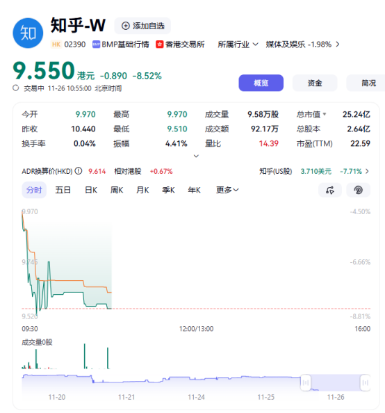 11月25日晚,知乎-W发布2025年第三季度业绩报告。报告显示,公司第三季度实现营收6.59亿元(人民 币,下同),同比下滑约22%;经调整净亏损2100万元,上年同期经调整净亏损1310万元。 | 知平-W 0 添加 知 | | | | | | | | | | | | | --- | --- | --- | --- | --- | --- | --- | --- | --- | --- | --- | --- | | HK 02390 BMP基础行情 ■香港交易所 | | | | | | | | 所属行业 √ 媒体及娱乐 -1.98% > | | | | | 9.550 #元 -0.890 -8.52% ○ 交易中 11-26 10:55:00 北京时间 | | | | | | | | 概览 | 资金 | | 筒况 | | 今开 | | 9.970 | 最高 | | 9.970 | | 成交量 | 9.58万股 | 总市值 ▼ | | 25.24亿 | | 昨收 | | 10.440 | 曼候 | | 9.510 | | 成交额 | 92.17万 | 总股本 | | 2.64亿 | | 换手率 | | 0 ...