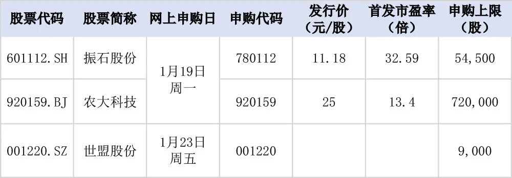 新股市场概况 - 2026年开年以来新股市场持续活跃 本周2只新股上市首日平均涨幅为292.35% 其中至信股份首日上涨213.44% 单签收益超2.3万元 [1] - 根据目前安排 若无变化 下周(1月19日至23日)有3只新股可申购 分别为沪市主板1只 深市主板1只和北交所1只 [4] 振石股份 - 公司是全球领先的风电叶片材料制造商 2024年风电玻纤织物全球市场份额超过35% 位列全球第一 产销规模全球领先 [1] - 公司客户覆盖全球前十大风电机组生产企业 国内客户包括明阳智能 远景能源 中材科技等 国际客户包括维斯塔斯 西门子歌美飒等 [1] - 公司主要从事清洁能源领域纤维增强材料研发 生产及销售 覆盖风力发电 光伏发电 新能源汽车 建筑建材等行业 [6] - 公司预计2025年全年实现营业收入70亿元至75亿元 同比增长57.70%至68.96% 预计实现净利润7.3亿元至8.6亿元 同比增长20.53%至42.00% [6][7] - 本次网上申购上限为5.45万股 顶格申购需配沪市市值54.5万元 发行价为11.18元/股 首发市盈率为32.59倍 [1][5] - 公司是近两年来发行股票数量第二多的沪市主板新股 这意味着其中签率可能会比较高 [1] 农大科技 - 公司是国内新型肥料行业龙头 主营业务为新型肥料及新型肥料中间体的研发 生产 销售和技术服务 [8] - 公司以腐植酸活化技术 包膜控释技术等为核心 主要产品包括腐植酸增效肥料 控释肥料 水溶肥料等 [8] - 2020年至2022年 公司包膜尿素产销量位居行业第一 腐植酸复合肥料产销量位居行业第二 [8] - 公司客户包括品牌农资生产企业 中国邮政 政府客户等 其新型肥料中间体推广应用于云天化 美盛农资 中农集团 中化化肥等大型企业 [1][8] - 公司预计2025年全年实现营业收入22亿元至24亿元 同比变动-6.91%至1.56% 预计实现净利润1.4亿元至1.6亿元 同比变动-3.64%至10.13% [8][9] - 本次发行价为25元/股 首发市盈率为13.4倍 网上申购上限为72万股 [5][8] 世盟股份 - 公司是覆盖全国的领先综合物流企业 专注于为跨国制造企业提供定制化 一体化 嵌入式的供应链物流解决方案 [2][9] - 公司提供运输服务 仓储及管理服务 关务服务在内的全方位综合物流服务 [9] - 公司主要客户包括汽车制造业的奔驰汽车和现代汽车 包装领域的利乐包装和安姆科 工业机器人及机床部件领域的发那科 韩国SK集团等 [2] - 公司预计2025年全年实现营业收入9.245亿元 同比下降10.08% 预计实现归属于母公司所有者的净利润1.4846亿元 同比下降12.70% [9][10] - 本次网上申购上限为9000股 [5]