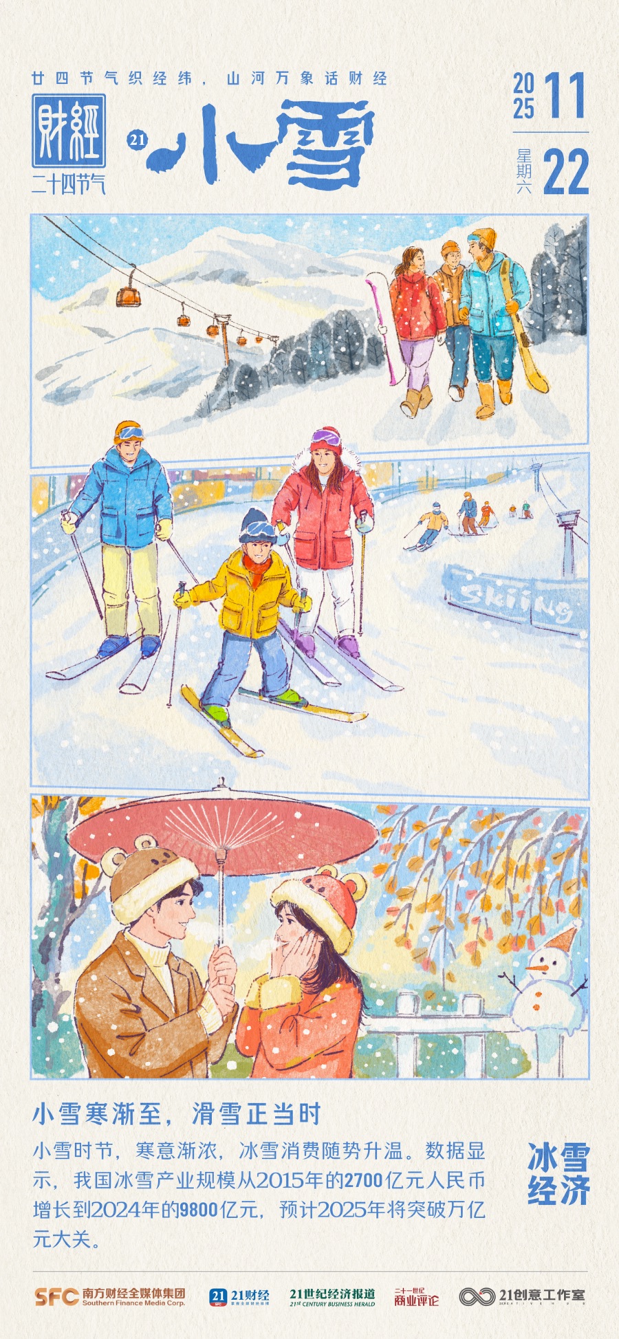 廿 四 节 气 织 经 纬 , 山 河 万 象 话 财 经 29 11 21 卖 22 - 川市气 e B. 今日小雪(2025年11月22日),寒意渐浓,冰雪消费随势升温。《中国冰雪产业发展研究报告(2025)》显示,我国冰雪产业 规模从2015年的2700亿元增长到2024年的9800亿元,预计2025年将达到10053亿元,突破万亿大关。 冰雪文旅如何点燃消费市场?冰雪产业正经历哪些新变革?本期《财经二十四节气》带你看。 01 小雪启幕新雪季 雪场陆续"开板" 小雪已至,朔风催雪,冰雪经济市场活力涌动。第十五届全国运动会的举办点燃了全民运动热情,体育活力持续释放,冰雪运 动从专业赛场走向大众生活,成为越来越多人的冬季消费选择。《大众冰雪消费市场研究报告(2024—2025冰雪季)》显示, 2024—2025年冰雪季期间,全国居民参加冰雪运动人数达2.92亿人,参与率为20.61%,冰雪经济的热度正持续攀升。 这股开板热潮不仅点燃了滑雪热情,更带动冰雪文旅消费释放强劲动能。去哪儿旅行数据显示,新疆可可托海国际滑雪度假区 开板仅一周,富蕴县春节前酒店预订量环比增长51.6%;吉林北大湖滑雪度假区开板消息发布 ...