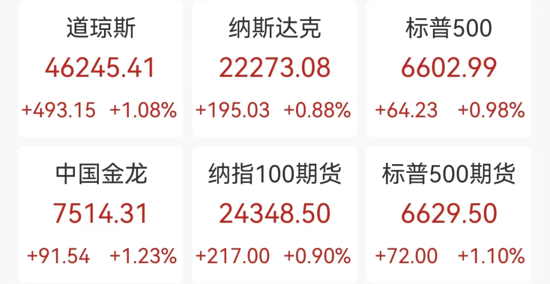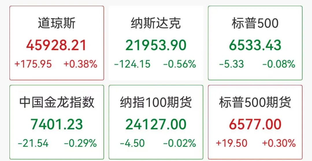 美联储多位官员最新发声提振市场情绪,美东时间周五,美股三大指数一度跳水后集体反弹,其中道指上涨近500点,收幅约1.1%。但周五的反弹不足以 弥补之前的大跌,纳指本周累计跌超2.7%,已连续第三周下跌,创下自3月以来最长的周线连跌纪录。标普500指数、道指均周跌超1.9%。 | 道琼斯 | 纳斯达克 | 标普500 | | --- | --- | --- | | 46245.41 | 22273.08 | 6602.99 | | +493.15 +1.08% +195.03 +0.88% +64.23 +0.98% | | | | 中国金龙 | 纳指100期货 | 标普500期货 | | 7514.31 | 24348.50 | 6629.50 | | +91.54 +1.23% +217.00 +0.90% +72.00 +1.10% | | | | 伦敦金现 | 伦敦银现 | | | --- | --- | --- | | 4064.279 49.989 | | 4062.8 | | -12.311 -0.30% -0.642 -1.27% +2.8 +0.07% | | | | COMEX白银 SHFE ...