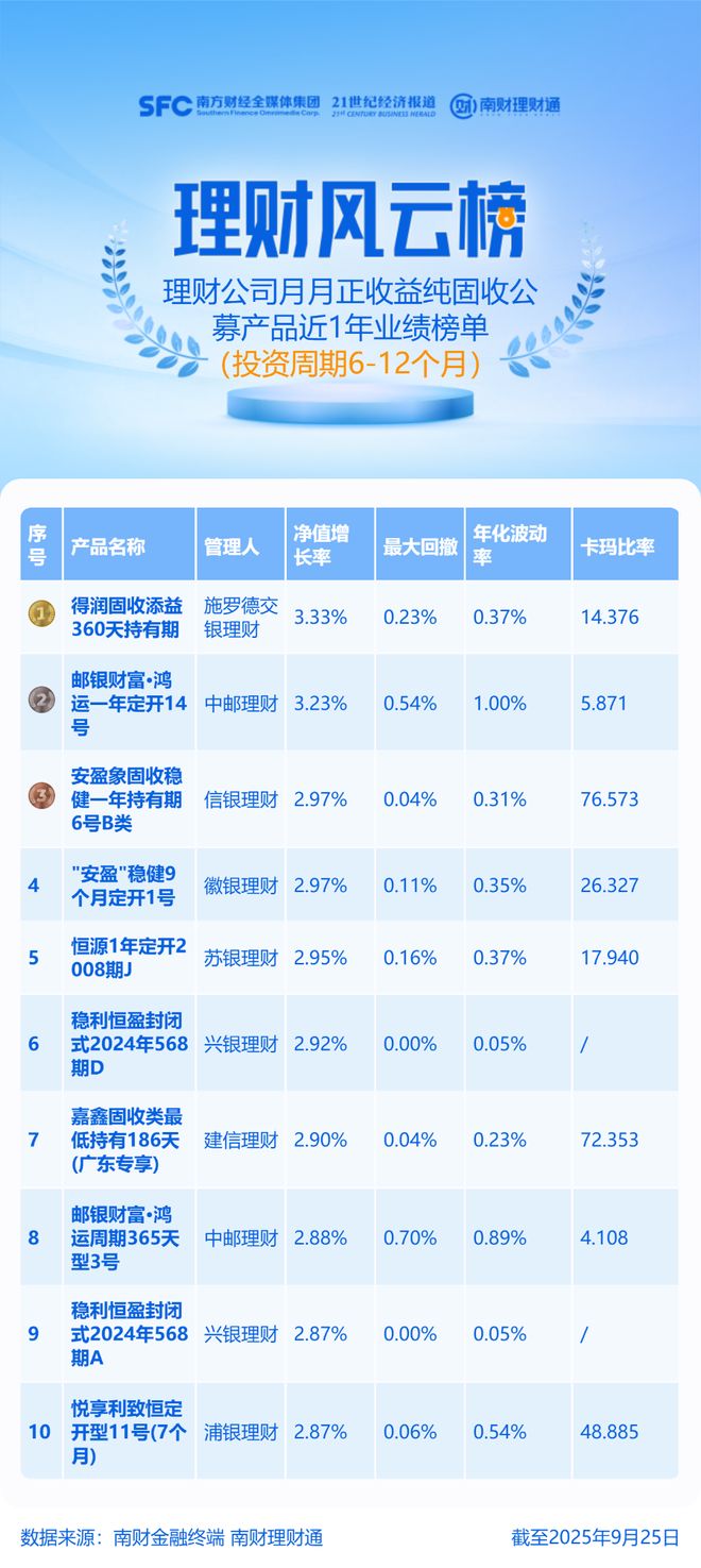数据说明: 产品统计范围为理财公司发行的投资周期在6-12个月(含)的公募纯固收产品,且近1年每个完整的自 然月月末均为正收益。产品统计截止日期为2025年9月25日,统计区间为近1年。 媒体集团 21世纪经济报道 (财)南财电财产 公司月日正收益年国收 募产品近1年业绩榜单 投资周期6-12个月) | J10 | 产品名称 | 管理人 | 净值增 长率 | 最大回撤 | 年份的时 趣 | 卡玛比率 | | --- | --- | --- | --- | --- | --- | --- | | | 得润固收添益 360天持有期 | 施罗德交 银理财 | 3.33% | 0.23% | 0.37% | 14.376 | | | 邮银财富·远 运一年六月14 | 中邮理财 | 3.23% | 0.54% | 1.00% | 5.871 | | | 島 | | | | | | | | 安盛象固收稳 健一年持有期 | 信银理财 2.97% | | 0.04% | 0.31% | 76.573 | | | eaB系 | | | | | | | 4 | "安盈"稳健9 个月后第1号 | 徽银理财 | 2.97% | 0. ...