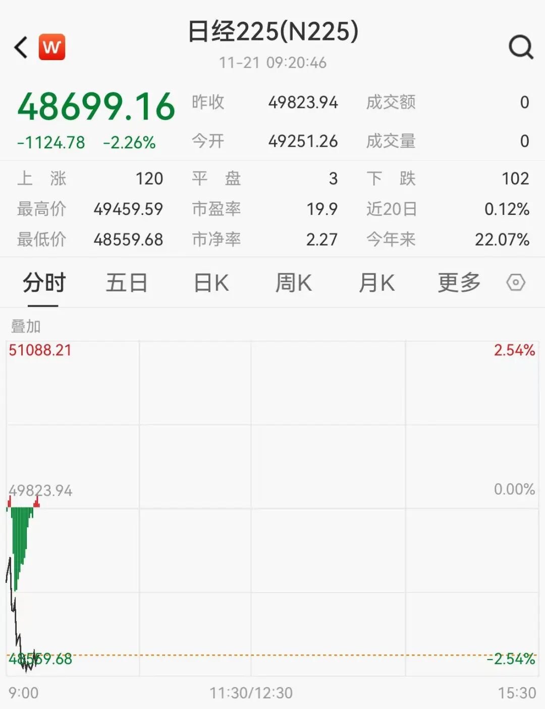 21日,全球市场避险情绪持续发酵,美股昨夜上演过山车行情,无独有偶,日韩股市开盘大跳水。 截至北京时间8:40左右,日经225指数跌超2%,软银集团股价下跌11%,创下自11月5日以来最大单日跌幅。 | < W | | 日经225(N225) | | | | --- | --- | --- | --- | --- | | | | 11-21 09:20:46 | | | | 48699.16 | | 昨收 | | 0 | | -1124.78 -2.26% | | 今开 49251.26 成交量 | | 0 | | 上 涨 | 120 | 中国 叶 3 | 下 跌 | 102 | | 最高价 | 49459.59 市盈率 | 19.9 近20日 | | 0.12% | | 最低价 | 48559.68 市净率 | 2.27 | 今年来 | 22.07% | | 分时 | 五日 | | 周K 月K 更多 © | | | 暨加 | | | | | | 51088.21 | | | | 2.54% | | 49823.94 | | | | 0.00% | | 48559.68 | | | | -2.54% | | ...