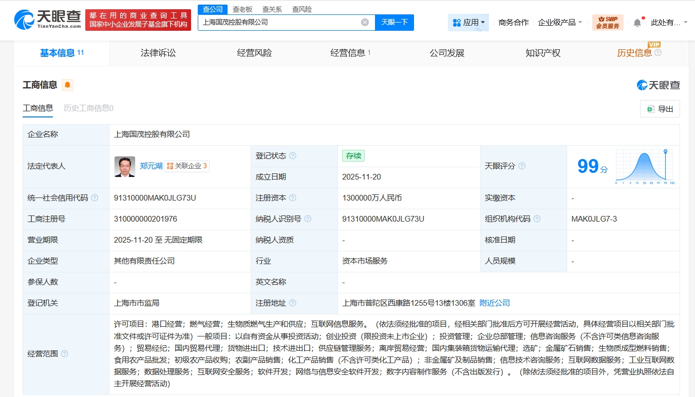 公司基本信息 - 上海国茂控股有限公司于2025年11月20日成立,法定代表人为郑元湖,注册资本为1300亿人民币 [1][2] - 公司登记状态为存续,企业类型为其他有限责任公司,行业属于资本市场服务,登记机关为上海市市监局 [2] - 公司注册地址位于上海市普陀区西康路1255号13楼1306室 [2] 股东结构与背景 - 公司由上港集团、上海国际信托有限公司、上海汽车工业(集团)有限公司、上海国际集团有限公司等共同持股 [1] - 股东名单包括东浩兰生(集团)有限公司、上海普陀国有资本投资有限公司、申能(集团)有限公司、上海华谊集团有限公司、东方国际(集团)有限公司、光明食品(集团)有限公司等多家上海市属国资企业 [2] 经营范围 - 许可项目包括港口经营、燃气经营、生物质燃气生产和供应、互联网信息服务 [2] - 一般项目包括以自有资金从事投资活动、创业投资(限投资未上市企业)、投资管理、企业总部管理、信息咨询服务、贸易经纪、货物进出口、技术进出口等 [1][2] - 其他业务涵盖供应链管理服务、离岸贸易经营、国内集装箱货物运输代理、选矿、金属矿销售、食用农产品批发、初级农产品收购、化工产品销售、信息技术咨询服务、数据处理服务、互联网安全服务、软件开发等 [2] 成立背景与政府批复 - 上港集团发布公告,宣布携手上海国际集团及其他多家上海市属国资企业,共同投资设立该公司 [1] - 公司组建基于上海市政府印发的《关于同意组建上海国茂控股有限公司的批复》 [1]