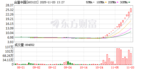 与火爆的股价表现形成鲜明对比的是,合富中国的经营业绩正处于低谷。根据合富中国2025年三季度报,前三季度公司实现营 业收入5.49亿元,同比下降22.8%;归母净利润亏损1238.62万元,同比下降146.65%。 11月20日,停牌核查仅3个交易日的合富中国(603122.SH)复牌再度受资金热捧,盘中封死涨停板,截至午盘,报26.18元/股, 涨停板封单资金达0.85亿元。这一走势让其10月28日以来的"妖股"行情再添一笔,15个交易日内斩获13个涨停板,累计涨幅高达 291.92%。 针对股价异动,21财经·南财快讯以投资者身份致电合富中国,接线工作人员明确表示,公司不存在额外利好信息,亦无应披露 而未披露的消息,对于复牌后再涨停是否会触发二次停牌,目前暂不明确。而对于市场热议的"看名炒股"助推股价说法,该工 作人员则以"不便评论"回应。 对此,合富中国解释称,主要受国内宏观形势变动,以及集中采购降价等医疗行业政策调整的影响,公司面向医院客户的产品 采购单价有所下调,叠加同期订单采购量较上年出现缩减,导致公司销售收入与利润水平同步下滑。 回溯本轮行情,合富中国的股价异动堪称疯狂。自10月28日行情启动至 ...
