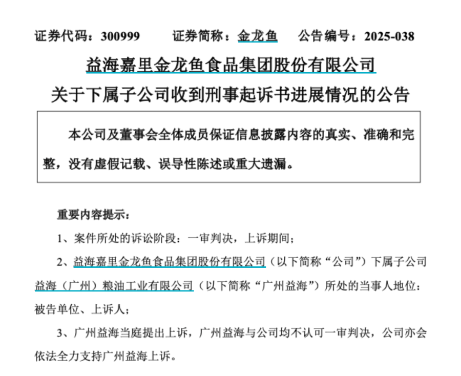 子公司被判合同诈骗罪 金龙鱼发表声明:已上诉