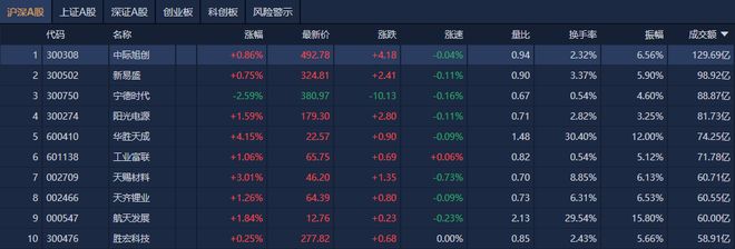 市场早盘高开低走,创业板指跌0.52%,此前一度涨超1.5%。南财金融终端显示,截至早盘收盘,沪指 涨0.38%,深成指跌0.05%,创业板指跌0.52%。全市场超3000只个股下跌。 从板块来看,银行板块走强,中国银行、工商银行均续创历史新高; 锂电池产业链表现活跃,百川股份等多股涨停; 光刻胶概念延续强势,国风新材2连板,百川股份涨停。 下跌方面,旅游酒店、食品、零售、纺织服装等泛消费方向走弱,水羊股份、南京商旅、益客食品等多 股大跌。 沪深两市半日成交额1.11万亿元,较上个交易日放量23亿。 个股方面,中际旭创成交额超129亿元居首,新易盛、宁德时代、阳光电源成交额靠前。 | PRAI | 上证A股 | 深证AB2 | 创业板 | 科创板 风险警示 | | | | | | | | | --- | --- | --- | --- | --- | --- | --- | --- | --- | --- | --- | --- | | 代码 | | 名称 | | 源幅 | 酮新价 | 甜歌 | 涨速 | 题比 | 换手率 | 從機 | 成交領 ▼ | | 1 300308 | | 中容相關 | | +078 ...