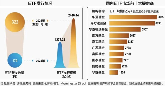 记者丨易妍君 编辑丨包芳鸣 国内ETF市场正以创纪录的发行规模宣告指数化投资浪潮的全面来临。 公募排排网数据显示,截至2025年11月18日,今年内全市场新发ETF数量及份额均已大幅超越去年全 年。 在政策推动与多元需求共同催生的蓬勃市场下,ETF产品结构也在经历深刻变化。科创、自由现金流等 主题ETF成为资金追逐的焦点。这不仅折射出投资者在低利率环境下对优质资产的重定义,更彰显出市 场配置工具日趋精细化的特征。 21世纪经济报道记者注意到,伴随着市场扩容,行业竞争格局也趋于固化。头部机构凭借品牌、产品线 与规模效应构筑起坚实护城河,未来ETF市场集中度有望进一步提升。 "当前的竞争格局对基金公司的产品创新、成本管控、投研运营及渠道品牌建设等多方面能力提出挑 战。"晨星(中国)基金研究中心总监孙珩向记者指出。 发行规模创新高 公募排排网数据显示,按认购起始日统计,截至2025年11月18日,今年以来全市场共计发行322只 ETF,合计发行份额达2446.44亿份;已超越去年全年的发行数量(179只)、发行规模(1275.31亿 份)。 相较2024年全年,今年内ETF新发数量增长了79.89%,发行份额增幅则 ...