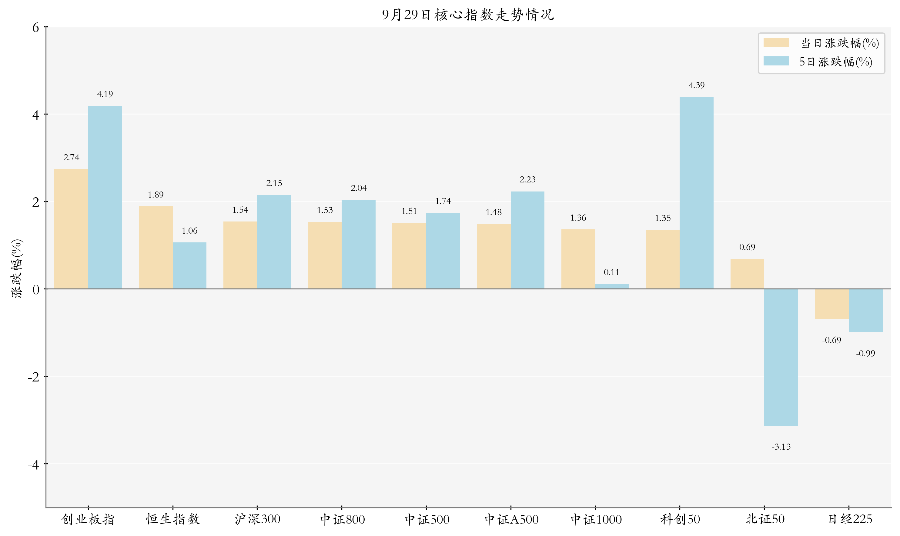 一、ETF行业快讯1.三大指数集体上涨,证券ETF爆发 今日,三大指数集体上涨,上证综指上涨0.9%,深证成指上涨2.05%,创业板指上涨2.74%。多只非银金融板块ETF上涨,其中,证券ETF龙头(159993.SZ)上 涨5.61%,券商ETF(159842.SZ)上涨5.19%,证券ETF富国(515850.SH)上涨5.07%。银行板块多只ETF下跌,银行ETF指数基金(516210.SH)下跌0.52%,银行 ETF天弘(515290.SH)下跌0.42%,银行ETF(159887.SZ)下跌0.39%。2.公募规模突破36万亿再创新高 据证券时报,据中基协最新披露的数据,截至8月末,我国公募基金总规模突破36万亿元大关,年内第五次创下历史新高。分产品类型来看,受益于8月权益 市场的欢腾以及增量资金的踊跃,担纲规模增长主力的为主动权益类基金,其中股票基金净值环比增幅高达12.76%,从历史数据来看,单月实现两位数增 长亦实属罕见,美国、中国香港市场的升温也带动QDII规模的上扬。二、今日行情速览1.指数走势 统计A股与海外主要核心指数走势,今日(9月29日,下同)三大指数集体上涨,其中上证指数上涨0 ...