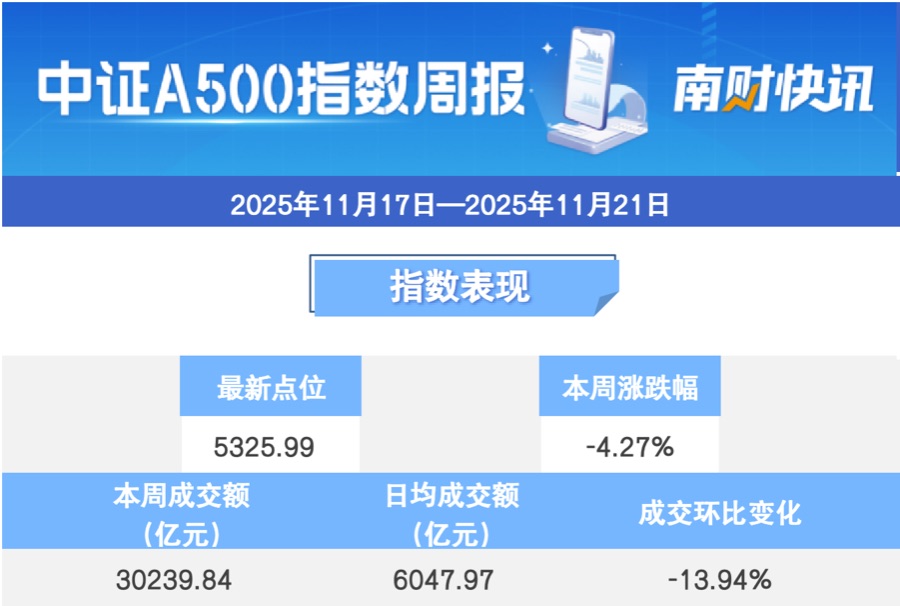 中证A500指数周报 ■▲ 南财快讯 2025年11月17日―2025年11月21日 指数表现 | 最新点位 | | 本周涨跌幅 | | --- | --- | --- | | 5325.99 | | -4.27% | | 本周成交额 | 日均成交额 | 成交环比变化 | | (亿元) | (亿元) | | | 30239.84 | 6047.97 | -13.94% | 中证A500成分股表现 本周涨幅前十 ↑ | 1 | 000547.SZ | 航天发展 | 31.77% | | --- | --- | --- | --- | | 2 | 300058.SZ | 蓝色光标 | 20.18% | | 3 | 603650.SH | 彤程新材 | 14.75% | | 4 | 688099.SH | 晶晨股份 | 9.66% | | 5 | 300346.SZ | 南大光电 | 8.47% | | 6 | 300459.SZ | 汤姆猫 | 8.37% | | 7 | 601988.SH | 中国银行 | 8.08% | | 8 | 601100.SH | 恒立液压 | 7.06% | | 9 | 00229 ...