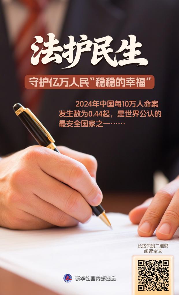 法护民生 守护亿万人民"稳稳的幸福" 2024年中国每10万人命案 发生数为0.44起,是世界公认的 最安全国家之一 长按识别二维码 阅读全文 守护国泰民安,护航高质量发展,维护社会公平正义……新华社"新华鲜报"栏目3篇报道,共同勾 勒出法治中国建设的生动图景。 一起感受良法善治的坚实步伐吧! 題目流之國非常常 國 F 37 2 12 激发高质量发展澎湃动能 全面清理废除妨碍统一市场 和公平完全的各种壁垒 深入推进 "江服分离" "一山一山" 武定 0000000 长按识别二 生在 阅读全 新华社国内部出品 海报制作:贾稀荃 新华社国内部出品 ge brogk 让公平正义之光温暖人心 法律制度回应人民群众对公平正 义的更高期盼;政法机关肩扛公正天 平、手持正义之剑,让公平正义更加 可知可感 …… 长按识别二维码 阅读全文 新华社国内部出品 策划:陈芳 记者:任沁沁、熊丰、刘硕 ...