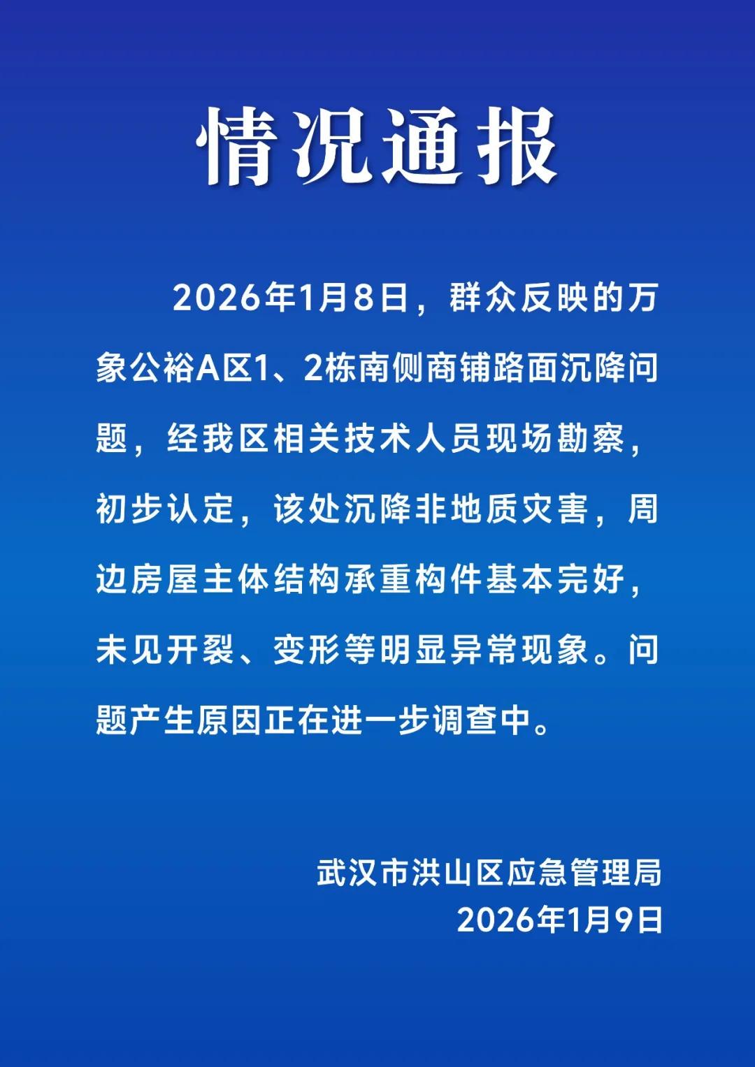 2026年1月8日,群众反映的万 象公裕A区1、2栋南侧商铺路面沉降问 题,经我区相关技术人员现场勘察, 初步认定,该处沉降非地质灾害,周 边房屋主体结构承重构件基本完好, 未见开裂、变形等明显异常现象。问 题产生原因正在进一步调查中。 武汉市洪山区应急管理局 2026年1月9日 情况通报 央视网消息:武汉市洪山区应急管理局1月9日通报,1月8日,群众反映的万象公裕A区1、2栋南侧商铺路面沉降问题,经洪山区相关技术人员现场勘察, 初步认定,该处沉降非地质灾害,周边房屋主体结构承重构件基本完好,未见开裂、变形等明显异常现象。问题产生原因正在进一步调查中。 ...