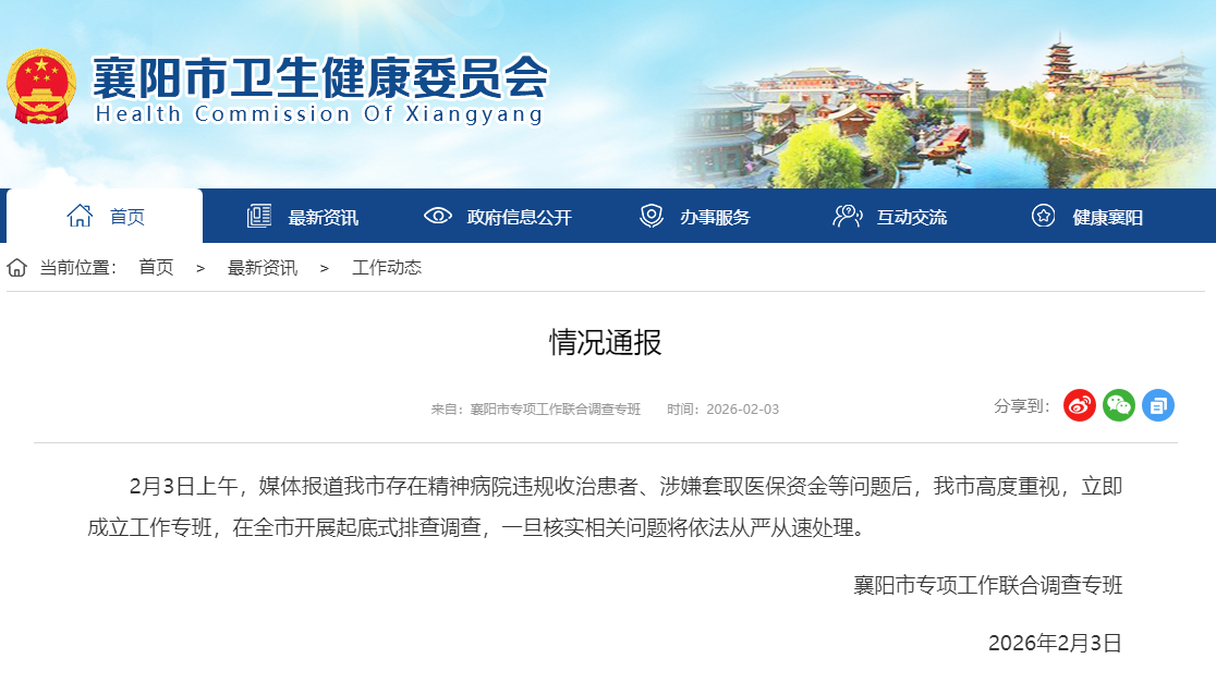 湖北襄阳通报“精神病院违规收治患者、涉嫌套取医保资金”:开展起底式排查调查