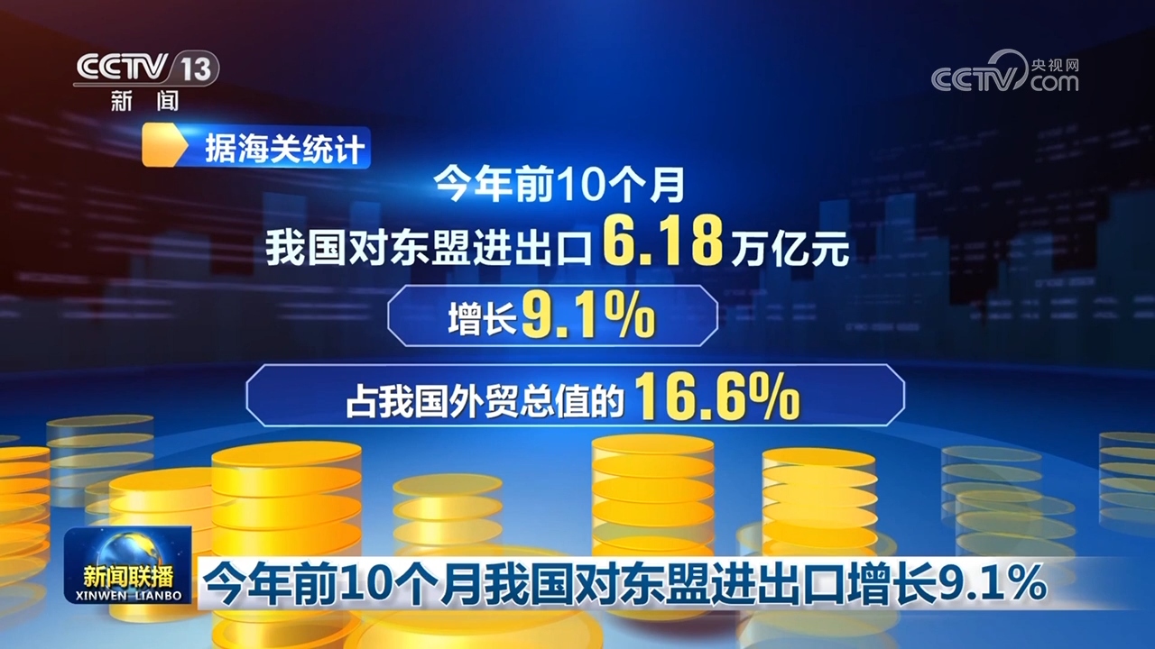 中国-东盟经贸关系 - 中国与东盟已连续5年互为第一大贸易伙伴 [1] - 2025年中国-东盟周于11月在福建举办 展现双方经贸合作丰硕成果 [1] 贸易规模与结构 - 今年前10个月中国对东盟进出口总值6.18万亿元人民币 同比增长9.1% [3] - 对东盟贸易额占中国外贸总值的16.6% [3] - 前10个月中国与东盟农食产品贸易额达513亿美元 同比增长8.9% [7] 出口产品结构 - 中国对东盟出口机电产品占出口总值60%以上 [5] - "新三样"等高技术 高附加值产品出口增长显著 [5] - 关税减免与贸易便利化政策推动双方产业互补优势释放 [5]