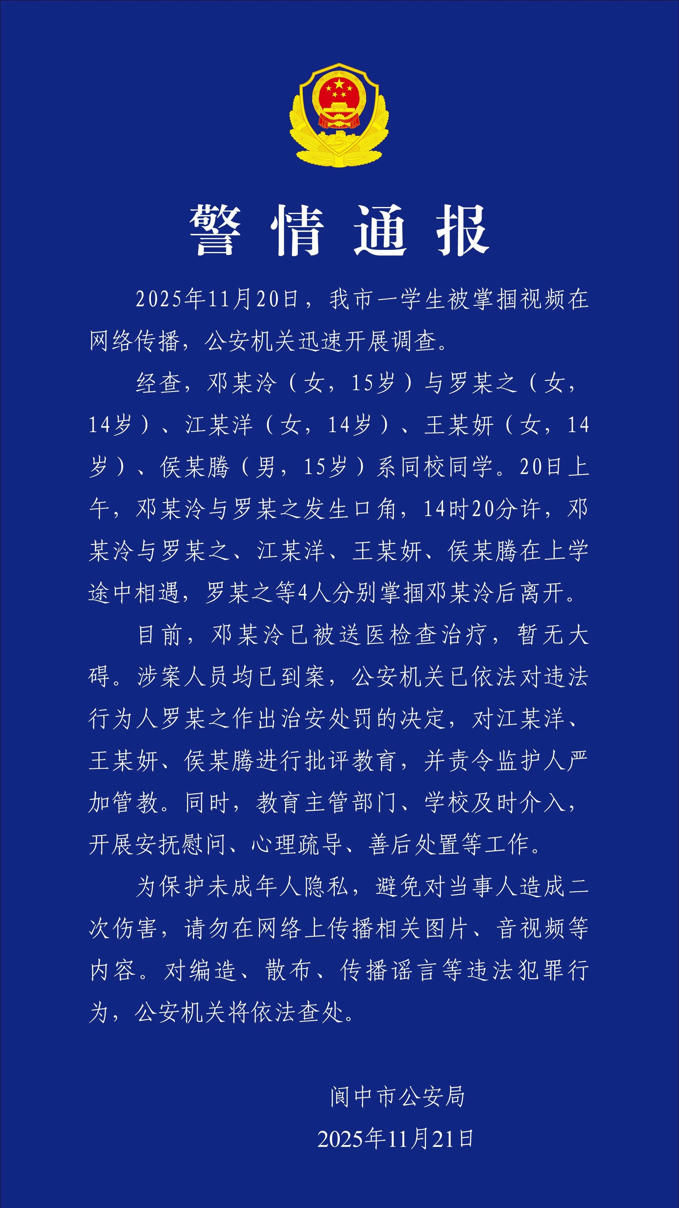 央视网消息:四川阆中市公安局11月21日发布警情通报:2025年11月20日,我市一学生被掌掴视频在网络传播,公安机关迅速开展调查。 经查,邓某泠(女,15岁)与罗某之(女,14岁)、江某洋(女,14岁)、王某妍(女,14岁)、侯某腾(男,15岁)系同校同学。20日上午,邓某泠与罗 某之发生口角,14时20分许,邓某泠与罗某之、江某洋、王某妍、侯某腾在上学途中相遇,罗某之等4人分别掌掴邓某泠后离开。 目前,邓某泠已被送医检查治疗,暂无大碍。涉案人员均已到案,公安机关已依法对违法行为人罗某之作出治安处罚的决定,对江某洋、王某妍、侯某腾进 行批评教育,并责令监护人严加管教。同时,教育主管部门、学校及时介入,开展安抚慰问、心理疏导、善后处置等工作。 为保护未成年人隐私,避免对当事人造成二次伤害,请勿在网络上传播相关图片、音视频等内容。对编造、散布、传播谣言等违法犯罪行为,公安机关将依 法查处。 岁)、侯某腾(男,15岁 午,邓某泠与罗某之发生 某泠与罗某之、江某洋、 途中相遇,罗某之等4人分 目前,邓某泠已被主 碍。涉案人员均已到案, 行为人罗某之作出治安处 王某妍、侯某腾进行批评 加管教。同时,教育主管 开展安抚 ...