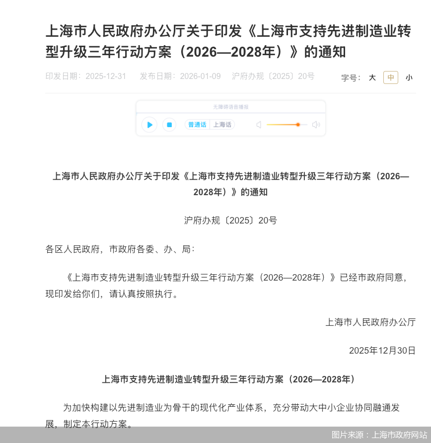 北京商报讯(记者 胡永新)1月9日,上海市人民政府办公厅印发的《上海市支持先进制造业转型升级三年行动方案(2026 —2028年)》指出,引导保险机构围绕首台(套)重大技术装备、首批次新材料提供定制化保险服务。 图片来源:上海市政府网站 ...
