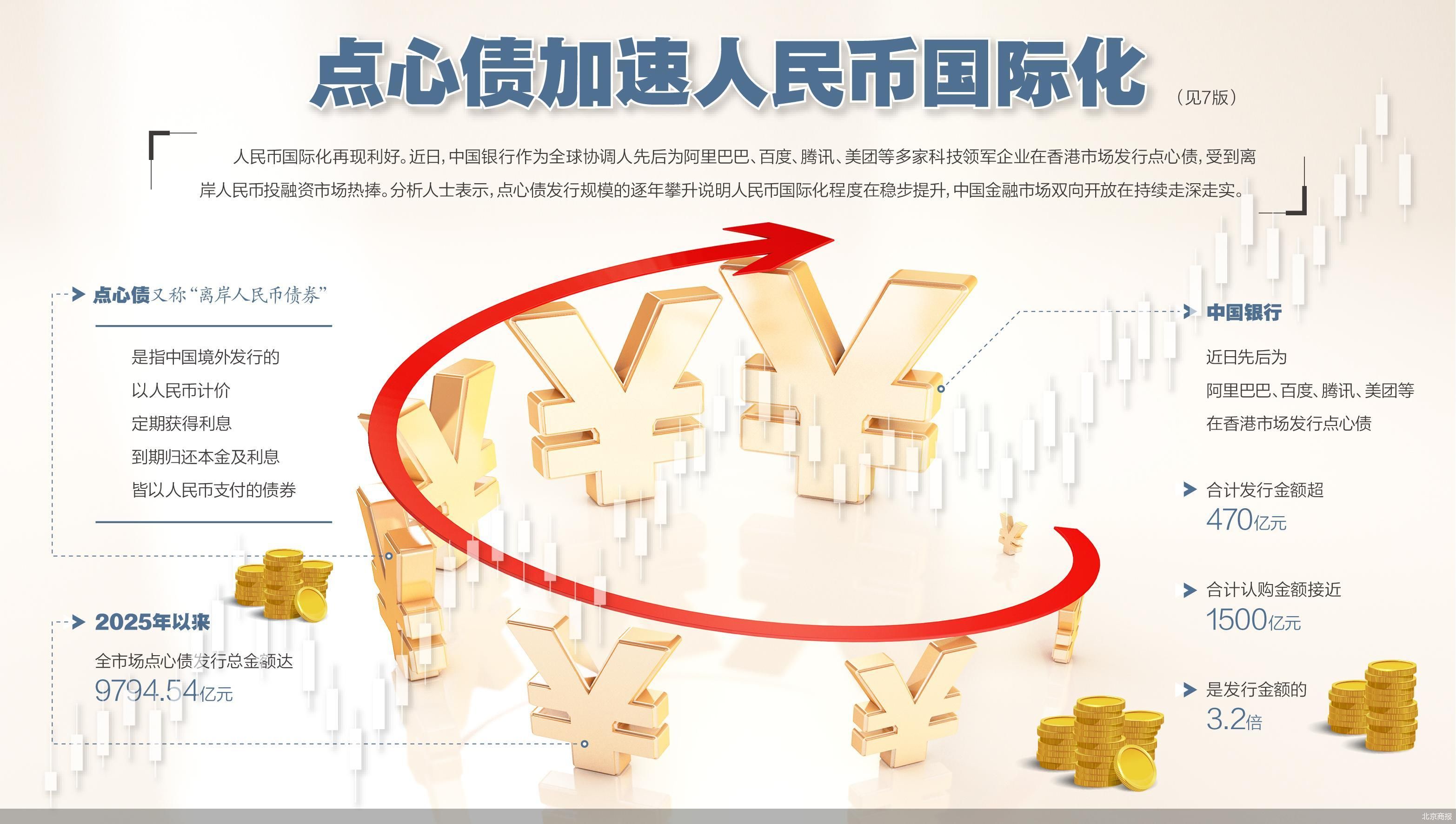 人民币国际化再现利好。11月18日,北京商报记者注意到,近日,中国银行作为全球协调人先后为阿里巴巴、百度、腾讯、美团等多家科技领军企业在香港 市场发行点心债,合计发行金额超过470亿元。近年来,点心债市场规模壮大的同时,债券品种日益丰富、发行主体呈多元化趋势,尤其是科技龙头企业的 加入,显著提升了市场活力。而这,正是人民币国际化加速推进的重要注脚。 中信证券首席经济学家明明进一步分析,当前人民币在国际货币体系中地位提升,点心债为境外投资者提供了配置人民币资产的渠道。离岸人民币资金池扩 大,国际贸易和投资活动产生大量留存境外的人民币资金,为点心债市场扩容提供资金基础。此外,香港作为全球最大的人民币离岸中心,具备成熟的金融 市场体系和专业服务能力,吸引企业发行点心债,且内地与香港金融市场互联互通加强,中国与国际金融市场融合程度加深。 "按当前节奏,2025年全年点心债发行量有望达1.2万亿—1.3万亿元,2026年或冲击1.5万亿元。"中国企业资本联盟副理事长柏文喜说道。同时,预计利率中 枢仍有下行空间,1—3年期点心债利率将再降20—30bp,与境内倒挂幅度收窄。以点心债为抵押的回购、期货及利率互换即将推出,提 ...
