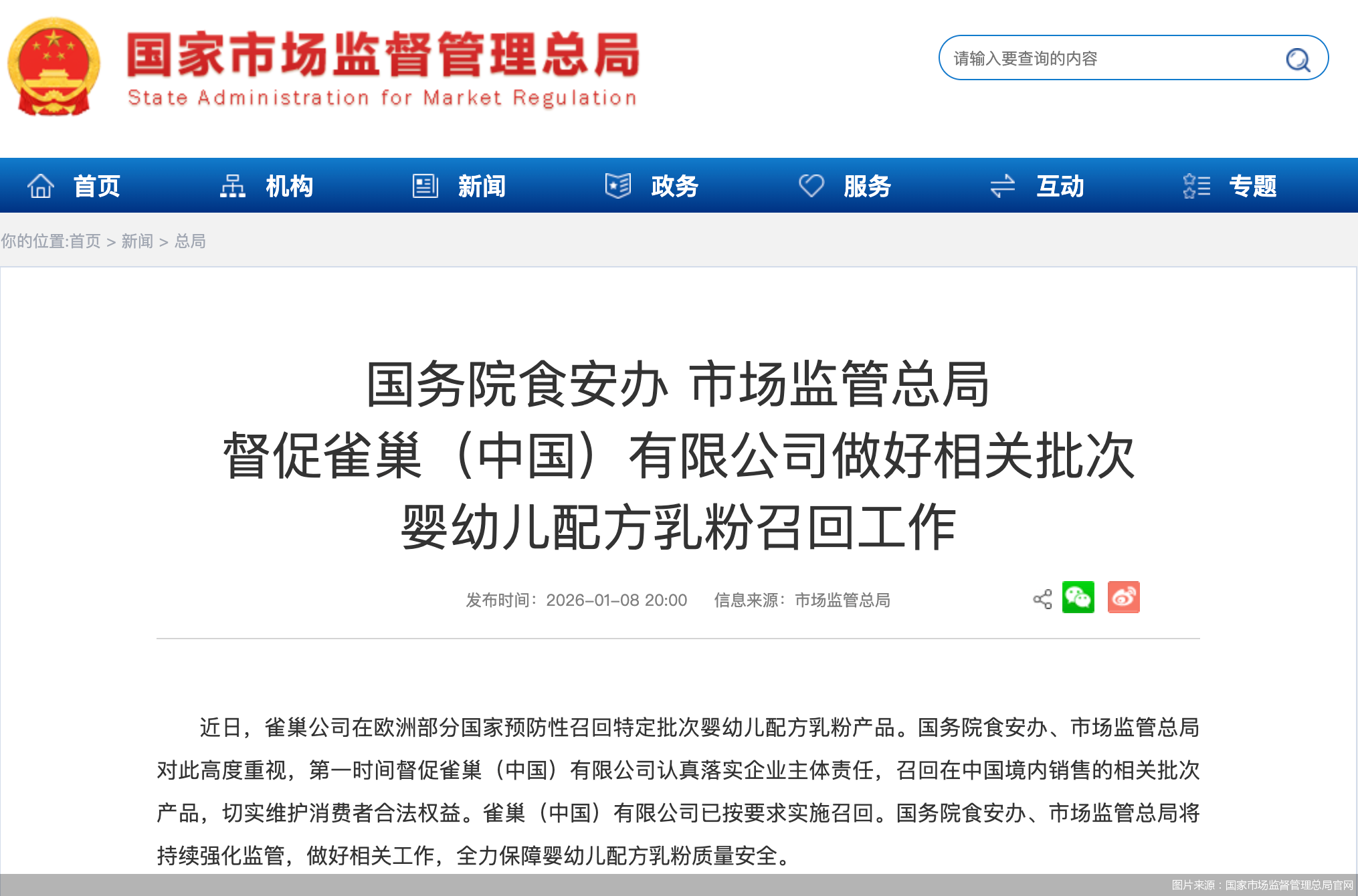 1月8日,雀巢集团再度发布消息称,可能存在有毒污染影响的婴幼儿配方奶粉,在全球召回范围进一步扩大至50国。当天晚间,国家市场监督管理总局官网 公告,国务院食安办、市场监管总局对此高度重视,第一时间督促雀巢(中国)有限公司认真落实企业主体责任,召回在中国境内销售的相关批次产品,切 实维护消费者合法权益。 1月7日,帝斯曼-芬美意发布声明称,"涉事问题ARA原料并非由帝斯曼-芬美意供应",并称"受以上事件影响,帝斯曼-芬美意ARA原料需求激增,我们将全 力协调产能,满足市场需求"。 同一天,润科生物公众号发布声明称,"公司关注到某国际品牌婴幼儿配方奶粉因其供应商原料花生四烯酸(ARA)查出蜡样芽孢杆菌污染启动产品召回, 上述事件与润科公司无关,润科公司所有产品从原材料管控开始均通过独立、可追溯的供应链体系严格管控,无蜡样芽孢杆菌污染,高品质供给广大合作客 户"。 嘉必优暂无公开回应。据媒体此前公开报道,嘉必优表示,相关原料检测中,尚未出结果。"我们正联系相关的检测机构,包括监管部门,来做产品检测, 现在尚未出结果,所以暂时并未公告。结果出来以后我们会及时进行公告。" 嘉必优是A股科创板上市公司,1月8日,收盘大跌 ...