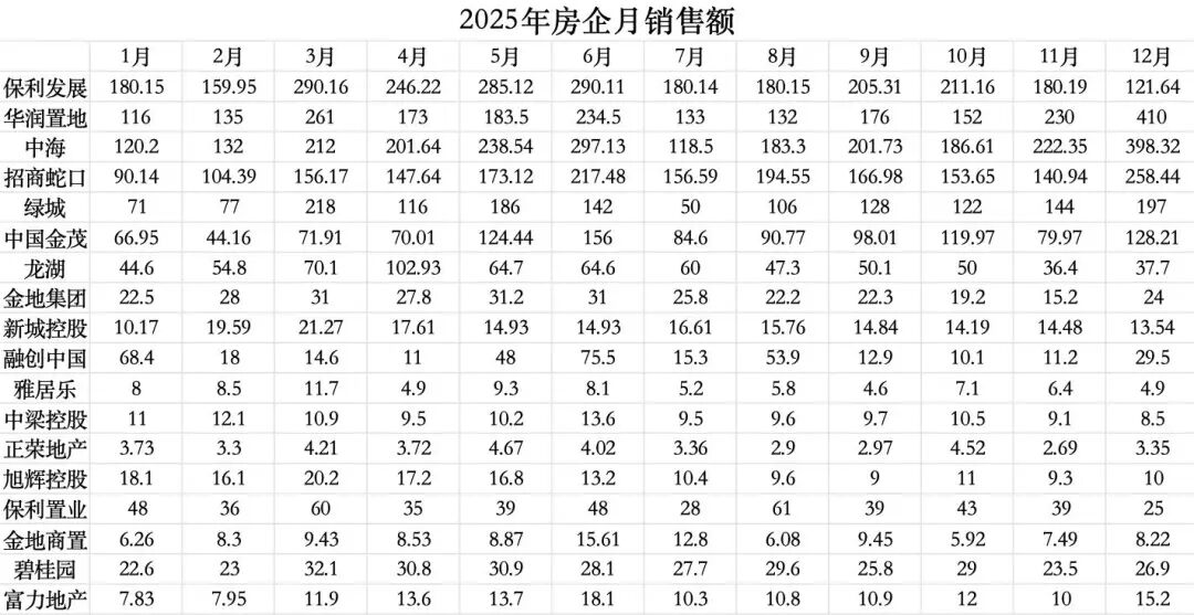 从2025年全年销售格局来看,头部房企竞争态势趋于稳定,保利发展以17.98亿元的销售额优势领先中海地产,继续保持行业第一位置。 随着2026年开年多家房企陆续披露单月销售业绩,北京商报记者统计发现,截至2026年1月12日,在已公布2025年12月销售数据的18家房企中,有13家实 现环比增长,占比达72.22%。其中,中国海外发展、华润置地、中国金茂等5家房企单月销售额更是创下全年最高纪录。 从2025年全年销售格局来看,头部房企竞争态势趋于稳定。保利发展以17.98亿元的销售额优势领先中海地产,继续保持行业第一位置。值得关注的是, 保利发展近年来持续重仓广州市场,布局战略显著。2023年至2025年三年间,保利发展在北京、上海的拿地金额分别为265.02亿元和359.27亿元,而在广 州的拿地金额则高达648.24亿元,显示出明显的区域倾斜策略。 | | 1月 | 2月 | 3月 | 4月 | 5月 | 6月 | 7月 | 8月 | 9 H | 10月 | 11月 | 12月 | | --- | --- | --- | --- | --- | --- | --- | --- | --- | --- | ...