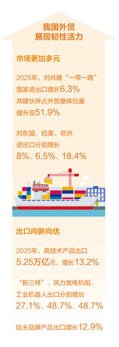 外贸总体表现 - 2025年全年中国外贸进出口总额达45.47万亿元人民币,同比增长3.8%,创历史新高,继续保持全球货物贸易第一大国地位 [4] - 2025年12月单月进出口额达4.26万亿元人民币,同比增长4.9%,刷新月度规模最高纪录 [5] - 进出口额已实现连续第九年增长,为入世以来时间跨度最长的连续增长 [5] 市场多元化进展 - 与共建“一带一路”国家进出口额达23.6万亿元人民币,同比增长6.3%,占外贸总值的比重提升至51.9% [2][5] - 对东盟进出口7.55万亿元人民币,增长8%;对拉美进出口3.93万亿元人民币,增长6.5%;对非洲进出口2.49万亿元人民币,增长18.4% [2][5] - 与240多个国家和地区有贸易往来,其中与190多个国家和地区进出口实现增长 [5] - 东盟已连续3年成为第一大出口市场,2025年对共建“一带一路”国家出口增长11.2%,拉动整体出口增长5.4个百分点 [8] 出口结构优化与升级 - 高技术产品出口额达5.25万亿元人民币,同比增长13.2%,拉动整体出口增长2.4个百分点 [2][5][8] - “新三样”、风力发电机组、工业机器人出口分别增长27.1%、48.7%、48.7% [2][5] - 专用装备、高端机床出口分别增长20.6%、21.5% [8] - 自主品牌产品出口增长12.9%,占出口总值的比重提升1.4个百分点 [5] - 绿色产品出口增长显著:锂电池出口增长26.2%,风力发电机组出口增长48.7%,电动摩托车及脚踏车出口增长18.1%,铁道电力机车出口增长27.1% [8] 进口表现与市场地位 - 2025年进口额达18.48万亿元人民币,规模创历史新高,连续17年成为全球第二大进口市场 [9] - 自6月份开始,进口连续7个月保持同比增长,12月份增速加快至4.4% [9] - 全年进口机电产品7.41万亿元人民币,增长5.7%,其中电子元件进口增长9.7%,电脑零部件进口增长20% [6] - 中国进口占全球进口份额保持在10%左右 [13] 经营主体活力 - 有进出口记录的经营主体超过78万家 [5] - 民营企业进出口额26.04万亿元人民币,增长7.1%,占外贸总值的比重提升至57.3%,继续发挥外贸“主引擎”作用 [5][10] - 民营企业出口高技术产品增长14.8%,其中高端装备增长26.9%,占全国比重近六成;在专精特新“小巨人”企业外贸总值中,民营企业占比超七成 [10] - 外资企业进出口额13.27万亿元人民币,增长3.7%,已连续7个季度保持增长 [10] - 国有企业进出口额6.06万亿元人民币,占外贸总值的13.3% [10] 区域外贸贡献 - 广东、江苏、浙江、上海、山东、北京、福建7省市合计进出口34.11万亿元人民币,增长2.7%,贡献了全国一半以上的外贸增量 [11] - 上述7省市高技术产品进出口增长11.4%,拉动其整体进出口增长2.2个百分点,电子信息、高端装备等产品进出口实现较快增长 [11] 中美经贸关系 - 根据双方统计数据,中国是美国第三大出口目的地国、第三大进口来源国;美国是中国第一大货物出口目的地国、第三大进口来源国 [6]