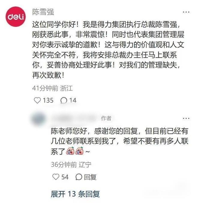 9月29日,有辽宁的网友发帖投诉称,她因走路跛脚被得力集团辞退,此事引发得力集团CEO陈雪强在 该帖下方留言致歉。9月30日,得力辞退跛脚员工、得力CEO道歉等多个话题登上微博热搜。 该网友称,她于今年5月通过了得力集团的两轮线上面试和1轮线下面试,入职岗位为集团上海分公司的 HRBP(人力资源业务合作伙伴),根据其发布的就职意向协议书,经双方沟通协商,该网友定于今年 5月13日在得力集团宁波总部入职报到。 但该网友表示,报到当天,人力曾问她腿部的情况,该网友表示不会影响正常工作,却被人力以"岗位 重要,领导一定不会同意"为由要求主动离开。她在帖子里表示,因为小时候得病,她走路跛脚,但不 需要拐杖和轮椅,目前已经有7年工作经验。 9月29日,有自称得力集团执行总裁陈雪强的网友在该帖子下方留言表示,获悉此事后非常震惊,他代 表集团管理层表示诚挚的道歉,并称此事与得力的价值观和人文关怀完全不符,"我将安排总裁办主任 马上联系你,妥善协商处理好此事!对我们的管理缺失,再次致歉!"据媒体报道,得力集团客服确认 这是陈雪强本人账号。 图源网络 南都湾财社记者注意到,9月30日上午,该网友更新后续称,已在其他公司入职工作 ...