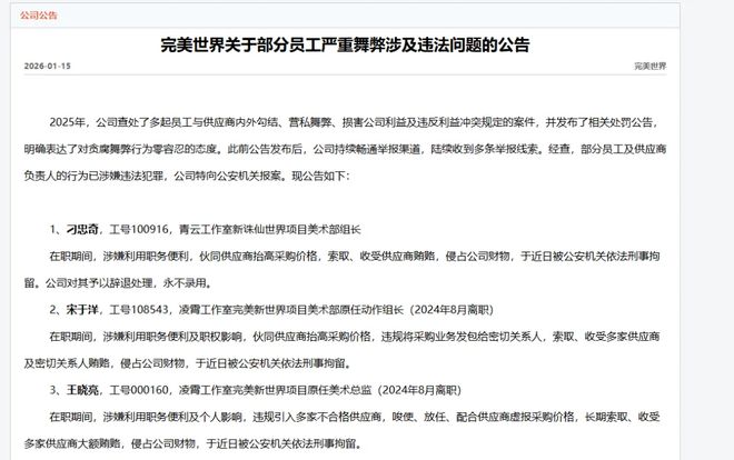 公司近期贪腐事件 - 2026年1月15日,完美世界公告披露3名美术相关负责人因涉嫌贪腐被公安机关依法刑事拘留 [1] - 涉案问题主要集中在美术外包与采购管理环节,涉案人员来自青云工作室和凌霄工作室 [1] - 公司表示对贪腐舞弊行为零容忍,在2025年查处多起案件后持续收到举报,并向公安机关报案 [2] 涉案人员具体情况 - 刁忠奇(工号100916),青云工作室《新诛仙世界》项目美术部组长,涉嫌利用职务便利伙同供应商抬高采购价格、索取收受贿赂、侵占公司财物,已被辞退并永不录用 [2] - 宋于洋(工号108543),凌霄工作室《完美新世界》项目原任动作组长(2024年8月离职),涉嫌利用职务便利及职权影响伙同供应商抬高价格、违规发包业务给关系人、索取收受贿赂、侵占公司财物 [2][3] - 王晓亮(工号000160),凌霄工作室《完美新世界》项目原任美术总监(2024年8月离职),涉嫌利用职务便利及个人影响力违规引入不合格供应商、唆使配合供应商虚报价格、长期索取收受大额贿赂、侵占公司财物 [2][3] 公司历史反贪腐行动 - 近两年公司多次披露反贪腐进展,2025年7月公告称百万等3个工作室8名在职及离职人员涉嫌与供应商勾结损害公司利益并报案 [5] - 2024年8月公司曾通报星云工作室等部分员工收贿、职务侵占等违规行为 [5] 实际控制人近期减持 - 2026年1月5日,公司实际控制人池宇峰通过集中竞价和大宗交易减持686万股,以当天约16.7元的均价计算,此次减持入账超1亿元 [5] - 减持完成后,池宇峰及其一致行动人的持股比例由32.35%降至31.99% [5][6] - 自2019年6月限售股解禁以来,这已是池宇峰进行的第五轮大规模减持,六年多时间里通过二级市场减持、协议转让、现金分红等途径累计进账近百亿元 [6] 公司近期经营与财务表现 - 2024年公司营收55.70亿元,同比下滑28.50%,净利润亏损12.88亿元,相较于2023年4.91亿元的盈利,由盈转亏 [7] - 2024年因预期收益不佳,公司关停了《完美新世界》《灵笼》等多个在研项目,并进行了大规模人员优化,员工总数从2023年末的5700多人锐减至2024年末的不足4000人 [7] - 随着游戏《诛仙世界》于2024年底上线,公司业绩开始回暖,2025年第三季度实现营业收入17.26亿元,同比增长31.45%,实现归母净利润1.62亿元,同比增长176.59% [7] - 2025年前三季度,公司实现营业收入54.17亿元,同比增长33.00%,实现归母净利润6.66亿元,成功实现扭亏为盈 [7]