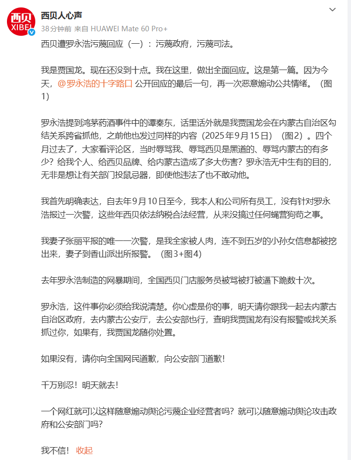 近日,西贝确认将关闭全国102家门店,公关副总裁宋宣也宣布离职,此前企业与罗永浩的"预制菜之 争"余波不断。1月16日,罗永浩发长文称,"这辈子没见过一个企业没犯别的错误,仅仅是因为被黑, 就能倒闭的。"随后,贾国龙公开发声,"今晚10点,将就罗永浩对西贝的重大污蔑诽谤一一全面回 应。"随后,#贾国龙今晚10点全面回应# 登上社交媒体热搜。 1月16日21时33分,贾国龙用账号@西贝人心声发布了第一篇回应博文: 1月16日晚,南都N视频记者从罗永浩方面相关人士处获悉,罗永浩以及贾国龙双方微博账号均被禁 言。微博官方表示,网络名人账号因个人争端和利益冲突等原因,策划或组织网上论战骂战、线下约 架,攻击竞争对手,挑起网络戾气,占用公共资源。 (文章来源:南方都市报) 此间有个小插曲,罗永浩一度回应贾国龙"今晚10点回应"的博文:"估计是华与华之后,又被什么山寨 公关公司忽悠了,突然有点心酸......我能忍尽量忍吧,唉。" 贾国龙则回复:"千万别忍,忍不是你性格,也不是我性格。你也别一提自己错的就忍,后面还有很 多。" ...