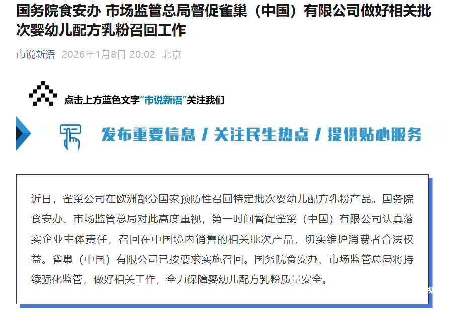 1月8日晚,市场监管总局官方公众号"市说新语"发文称,针对雀巢公司在欧洲部分国家预防性召回特定批次婴幼儿配方乳粉产 品一事,国务院食安办、市场监管总局对此高度重视,第一时间督促雀巢(中国)有限公司认真落实企业主体责任,召回在中 国境内销售的相关批次产品,切实维护消费者合法权益。 (文章来源:南方都市报) 市场监管总局表示,雀巢(中国)有限公司已按要求实施召回。国务院食安办、市场监管总局将持续强化监管,做好相关工 作,全力保障婴幼儿配方乳粉质量安全。 近日,因供应商原料存在质量问题,雀巢在多个国家预防性召回多批次奶粉。在中国市场,根据雀巢中国1月6日发布的两则召 回公告,雀巢在中国大陆召回涉惠氏、能恩等多个品牌共计71批次的产品。1月8日晚,南都湾财社记者查询雀巢全球总部发布 的公告,此次召回涉及47个国家,其中29个为欧洲国家。 ...