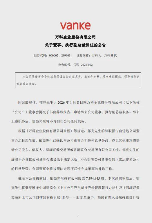 今天(1月8日),万科A(000002.SZ)发公告称,因到龄退休,郁亮于2026年1月8日向公司董事会提 交书面辞职报告,申请辞去公司董事、执行副总裁职务。辞去上述职务后,郁亮将不再担任公司任何职 务。 公告称,郁亮的辞职不会导致公司董事会成员低于法定人数,不会影响公司董事会的正常运作和公司的 日常经营。公司将尽快完成董事的补选工作。 据万科官网,郁亮,1965年出生,1988年毕业于北京大学国际经济学系,获学士学位;后于1997年获北 京大学经济学硕士学位。曾供职于深圳外贸集团。1990年加入万科,1992年任公司董秘,1994年起任公 司董事,1996年任万科企业股份有限公司副总经理,1999年任公司常务副总经理兼财务负责人,2001年 任公司总经理(总裁),2017年任万科董事会主席、总裁兼首席执行官。现任集团董事、执行副总裁。 南方都市报(nddaily)综合报道 郁亮。图据万科官网 ...
