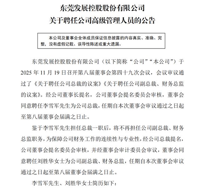 李雪军。图源:东莞控股 刘胜华,女,48 岁,中共党员,会计学本科,注册会计师、税 务师。历任本公司财务部总经理,东莞 市交通投资集团有限公司财务 管理部副部长、部长等职务。现任本公司副总裁、财务总监。 11月19日,东莞发展控股股份有限公司发布《关于聘任公司高级管理人员的公告》,公告显示,李雪军 任东莞控股总裁,刘胜华任公司副总裁、财务总监。 履历显示,李雪军,男,45 岁,中共党员,管理学学士。历任东莞控股董事会秘书、副总裁、财务总 监,曾兼任广东金信资本投资有限公司执行董事、总经理,东莞市轨道一号线建设发展有限公司董事等 职务。现任东莞控股总裁,兼任东莞市照洲投资有限公司执行董事、经理,东莞市康亿创新能源科技有 限公司董事。 东莞发展控股股份有限公司前身为广东福地科技股份有限公司,于1997年在深圳证券交易所上市。2004 年,莞深高速完成借壳上市,公司名称变更为"东莞发展控股股份有限公司",作为东莞市属国有控股上 市公司,东莞控股借力资本市场做强做优,从单一路桥经营发展成为目前以交通基础设施为"一体"、以 新型综合能源和金融投资为"两翼"的"一体两翼"业务布局。 东莞控股披露的2025年三季度报告显示 ...