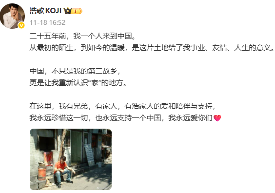 据环球时报报道,11月24日,日本演员矢野浩二在接受专访时表示,"'永远支持一个中国'是我发自肺 腑的心里话。" 对此,矢野浩二表示,11月18日发的微博并不是出于什么"立场"或"表态"的考虑,而是一种很自然、很 真实的心境。"我在中国生活、工作了25年,这里有我的家人和朋友,我对这里的一切都非常熟悉和喜 爱,那条微博也只是有感而发。'永远支持一个中国'是我发自肺腑的心里话。" 他表示,"至于(发这条微博)会不会在日本国内给我带来压力或影响,我无法预料,但即使真的有, 我也不会后悔,因为我所说的每一句话都是出自内心的真实感受。今天的我是无数中国人用善意和信任 一点点'成全'的。当我看到有人误解中国、攻击中国时,我很难沉默。我只是在用自己的方式,去守护 我所热爱的土地和这里的人。" 此前,矢野浩二曾发微博称,"中国不只是我的第二故乡,更是让我重新认识家的地方,我永远珍惜这 一切,也永远支持一个中国"。 ...