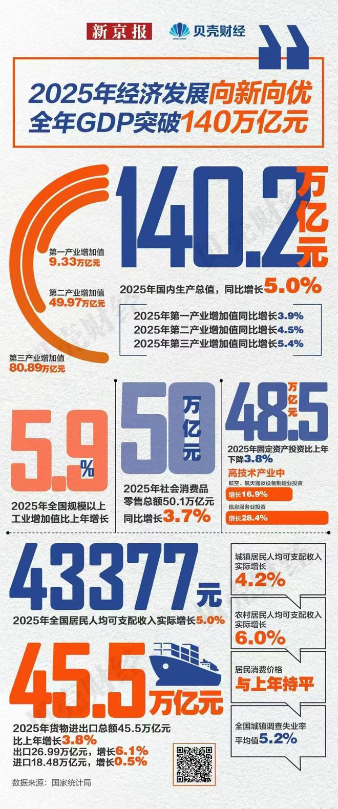 2025年中国宏观经济整体表现 - 全年国内生产总值突破140万亿元,达到140.1879万亿元,按不变价格计算同比增长5.0% [3] - 经济总量连续跨越110万亿、120万亿、130万亿、140万亿元大关,彰显经济韧性与高质量发展成效 [3] 三大产业增长情况 - 第一产业增加值同比增长3.9% [1] - 第二产业增加值同比增长4.5% [1] - 第三产业增加值同比增长5.4% [1] 需求侧与投资表现 - 社会消费品零售总额达50.1万亿元,同比增长16.9% [1] - 全国固定资产投资比上年下降3.8% [1] - 有效的投资在新型基础设施和重大民生工程等关键领域发挥了托底和牵引作用 [5] 工业与高技术产业发展 - 全国规模以上工业增加值比上年增长4.5% [1] - 高技术产业投资表现突出,其中航空、航天器及设备制造业投资增长16.9%,信息服务业投资同比增长77% [1] - 高技术制造业和现代服务业保持较快增长,人工智能、生物制造、商业航天等战略性新兴产业正成长为新的支柱产业 [4] 经济增长动力与结构转型 - 支撑经济增长的动力源发生深刻变革,以新质生产力为代表的创新驱动效应日益凸显 [4] - 数字经济与实体经济深度融合,中国经济正从依赖要素投入的粗放型增长,迈向形态更高级、结构更合理的集约型发展阶段 [4] - 消费结构正由生存型向发展型、享受型升级,服务消费、绿色消费、数字消费等新热点层出不穷,消费主引擎作用更加稳固 [4] 发展挑战与未来基础 - 在庞大基数上实现中高速增长,每增长一个百分点的难度系数呈几何级数增加 [5] - 经济发展面临外部环境不确定性上升,以及内部有效需求不足、部分行业产能过剩等挑战 [5] - 中国拥有世界上最完整的工业体系、最完善的配套能力、完备的基础设施网络以及庞大的人力与人才资源,为未来发展提供底气 [5] - 全面深化改革红利持续释放,高水平社会主义市场经济体制加快构建,全国统一大市场深入推进,将进一步激发市场主体活力 [6]