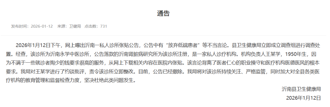 经查,该诊所为沂南永学中医诊所,公告落款的沂南肾脏病研究所为该诊所注册,是一家私人诊疗机构。机构负责人王某学,1950年生,因为不满于一些 就诊者掏少的钱要求很高的服务,从网上下载相关内容在医院内张贴。该言论背离了医者仁心的职业操守和医疗机构医德医风的根本要求。我局对王某学 进行了约谈批评,责令该诊所立即整改。 目前,公告已经撤除。我局将对该诊所持续关注、严格监管,同时加大对全县各类医疗机构的教育管理和监督检查力度,坚决杜绝此类问题发生。 1月12日,山东省临沂市沂南县卫生健康局发布通告: 2026年1月12日下午,网上曝出沂南一私人诊所张贴公告,公告中有"放弃低端患者"等不当言论。县卫生健康局立即成立调查组进行调查处置。 ...