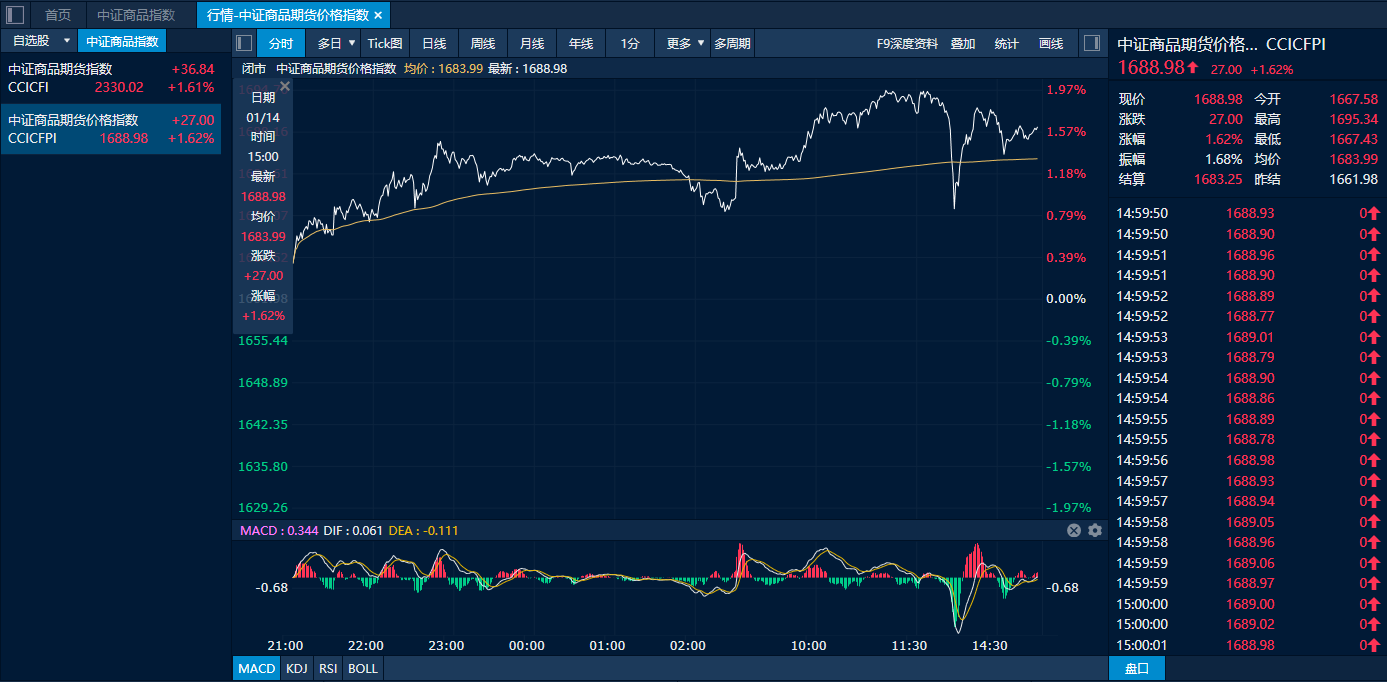 商品期货市场整体表现 - 国内商品期货市场1月14日涨跌互现,中证商品期货价格指数收报1688.98点,较前一交易日上涨27.00点,涨幅1.62% [1] - 中证商品期货指数收报2330.02点,较前一交易日上涨36.84点,涨幅1.61% [1] 金属板块表现强劲 - 沪锡主力合约收涨停板,涨幅8.00%,收于413170元/吨的历史新高,主要受刚果(金)锡矿产地山体滑坡事件刺激供应担忧,以及新能源、人工智能领域需求预期偏强驱动 [2] - 沪银主力合约涨超8%,国内银价冲破22000元/千克关口,一度逼近23000元/千克 [1][2] - 铂主力合约涨超3%,钯、沪金主力合约涨超1% [1][2] 能源化工板块走势分化 - 燃料油主力合约涨超6%,单日净增仓近1.8万手,主要受亚洲高硫燃料油到货可能减少(因委内瑞拉石油流向变化及伊朗局势)及船燃需求持稳的预期推动 [2] - SC原油、液化气、低硫燃料油等油气品种不同程度收涨,受隔夜国际油价触及近三个月高点带动 [3] - 碳酸锂主力合约跌超3%,主要受交易所调整交易手续费标准及交易限额,加速资金获利了结影响,但基本面预期仍偏强,受出口退税政策调整及新能源汽车消费提振 [4] - 烧碱主力合约跌超2%,跌破2100元/吨,主要受氧化铝价格走低、非铝需求偏弱、高库存及低利润等季节性因素影响 [1][4] 其他品种表现 - 纯苯、LU、尿素主力合约涨超2% [1] - 苹果、生猪、BR橡胶、沥青、塑料、甲醇、苯乙烯、丙烯主力合约涨超1% [1] - 玻璃主力合约跌超2% [1] - 双胶纸、焦煤、菜粕、多晶硅、焦炭、豆二主力合约跌超1% [1]